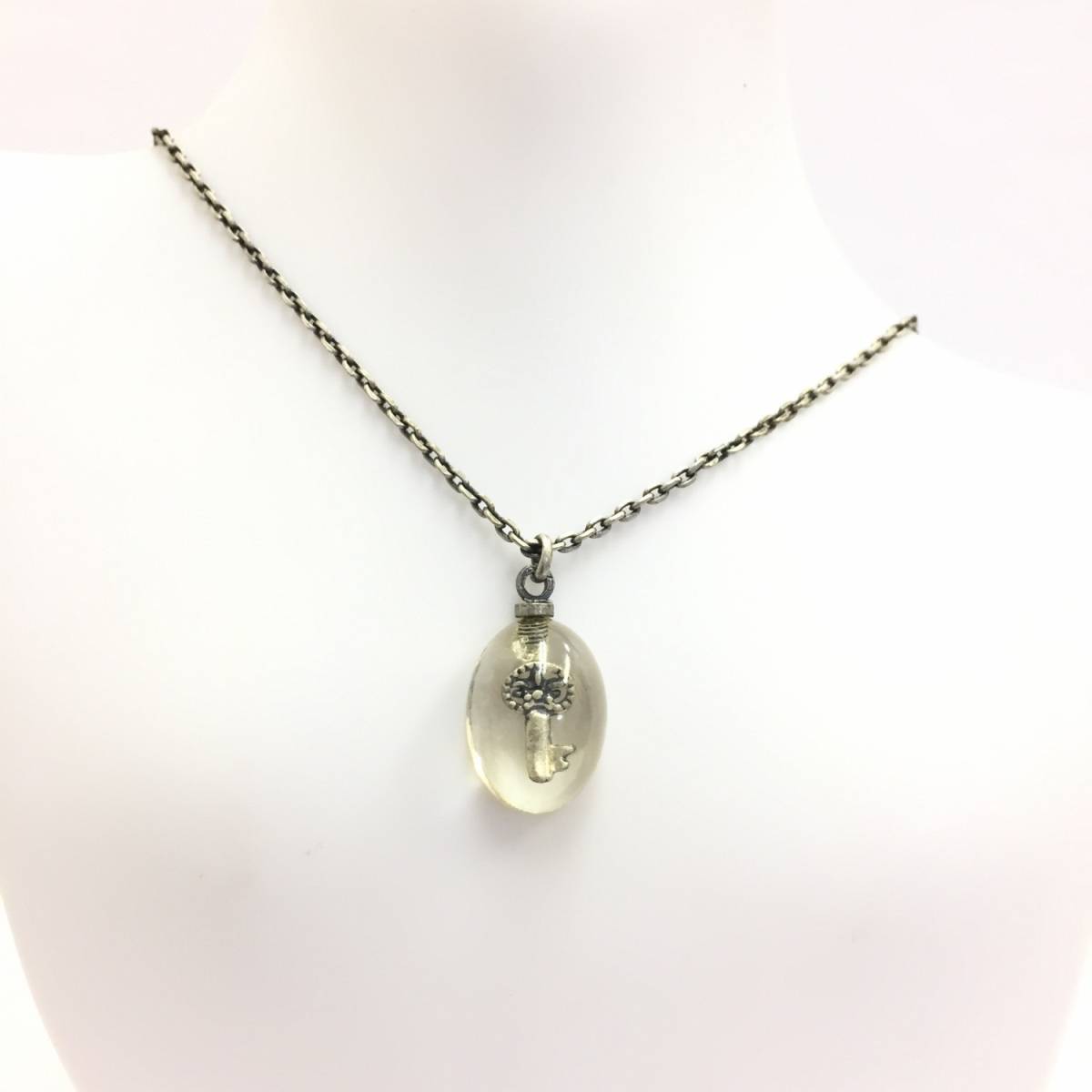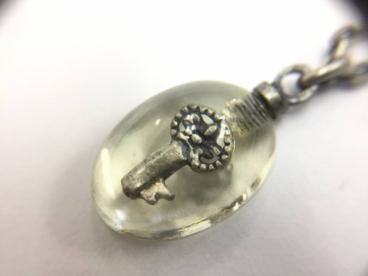 ペンダントの透明部分の素材はたぶんですが…樹脂だと思います。まるで鍵が浮遊しているような神秘的デザインです。 金属部分はいぶした色合いをしており、アンティーク調で素敵です。