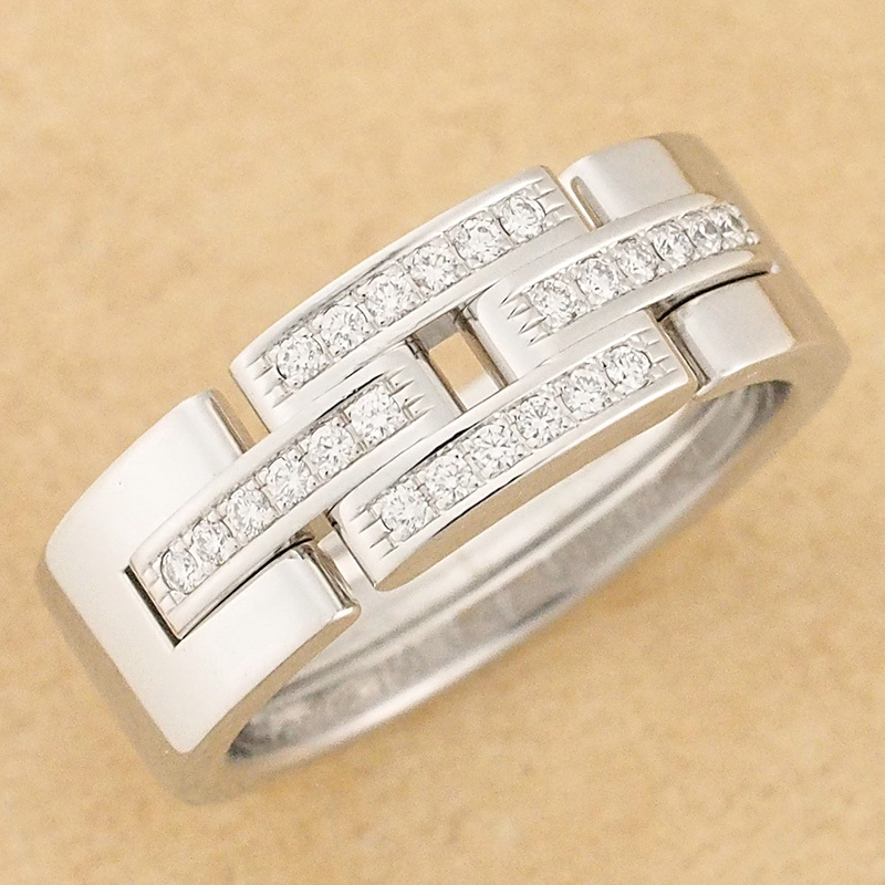 備考:メゾンを象徴する動物「豹」の名を冠した「パンテール」コレクション。パーツをブロック状に組み合わせ、正面部分に煌めくダイヤモンドをセットした、18金ホワイトゴールド製のマイヨンパンテールリングです。新品仕上済。