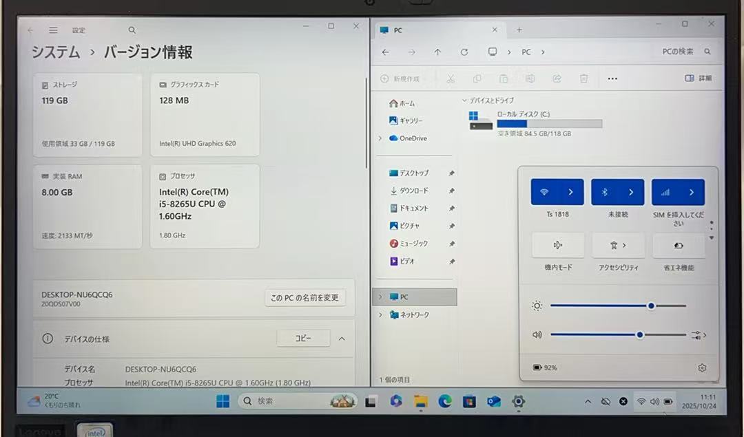 スペック:i5-8265U/@1.80/8GB/M.2 128GB/14インチ