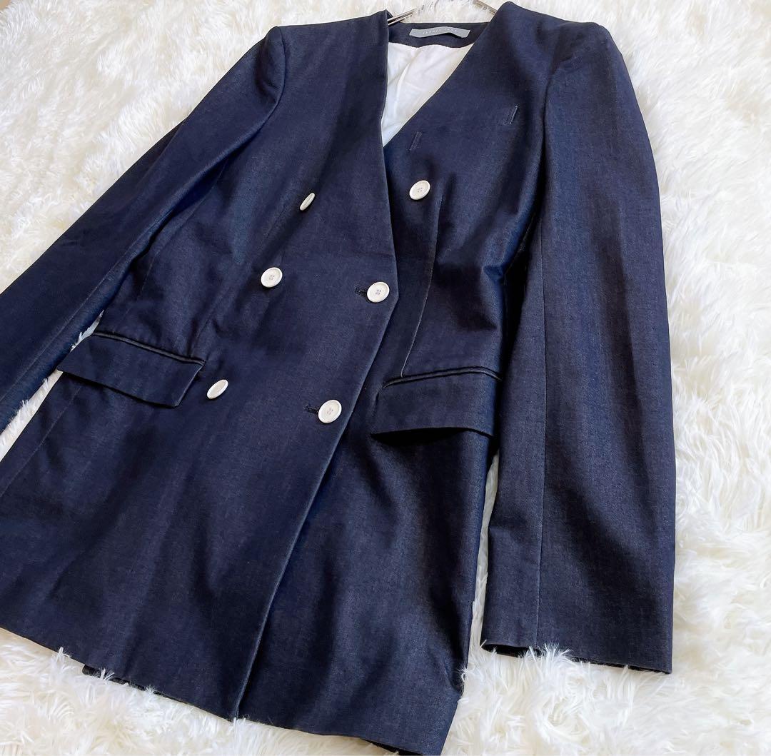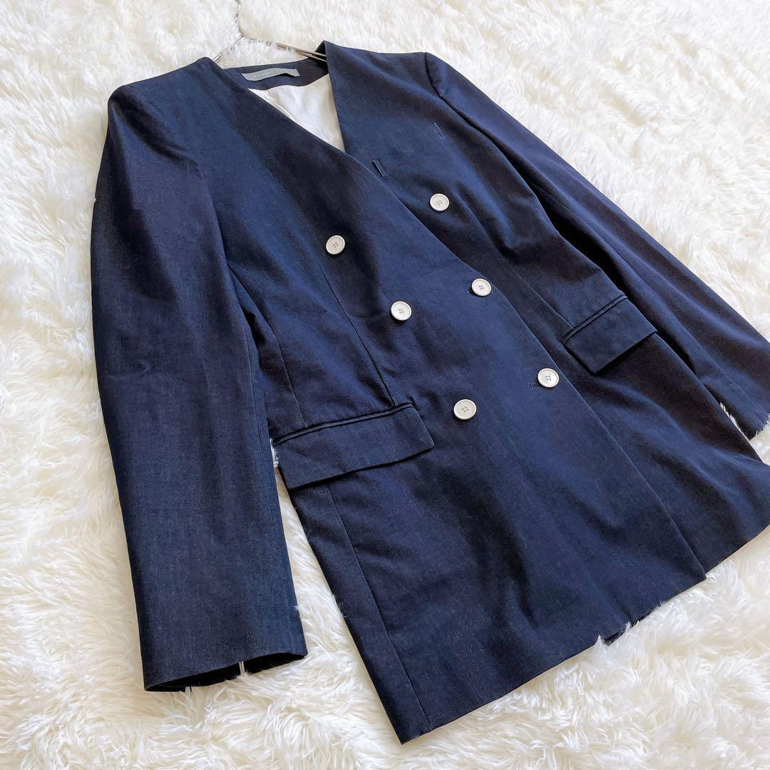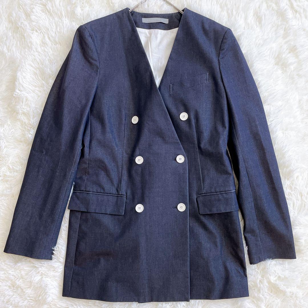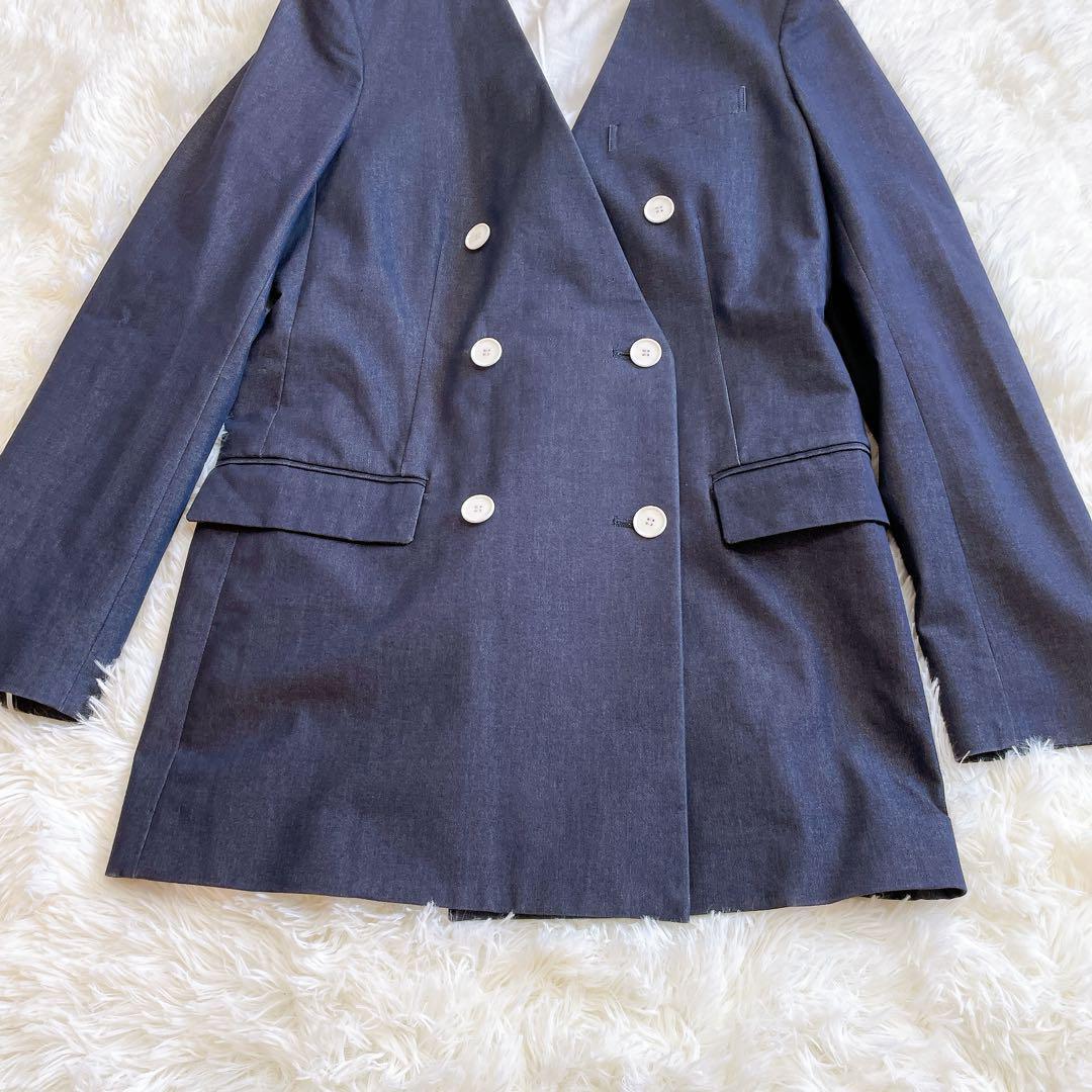 セオリーリュクス Theoryluxe ジャケット ノーカラー ダブルボタン ネイビー 紺 デニムブルー テーラード スーツ フォーマル オフィスカジュアル ビジネス 上品 綺麗め シンプル レディース 38サイズ Mサイズ 春秋 正規品