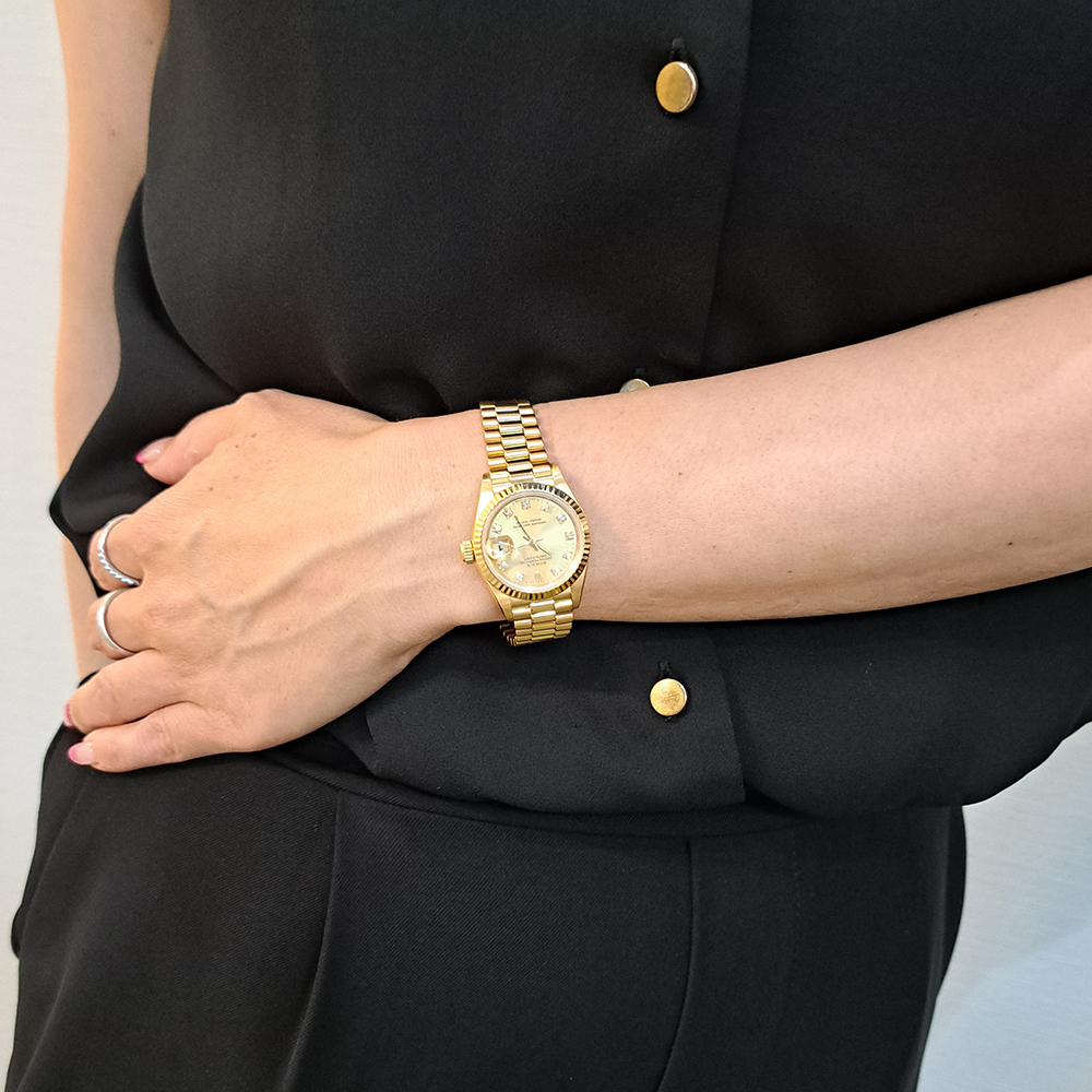 | コメント | ロレックス デイトジャスト 69178G 金無垢が入荷致しました。金無垢素材にシャンパンゴールドダイヤルと10Pの純正ダイヤモンドをセッティングしたゴージャスなモデルです。こちらの商品は風防ガラスにルーペで拡大すると微細なカケとベルトに若干の傷が御座いますが、肉眼ではそれ程気にならない程度です。 ~出品担当の中村より~ デイトジャストの定番人気モデルで、 まばゆい華やかさを演出するイエローゴールドのケースに、ダイヤインデックスがセッティングされたシャンパンカラーのダイヤルの組み合わせが、ワンランク上のラグジュアリー感を演出しています。 | ||
