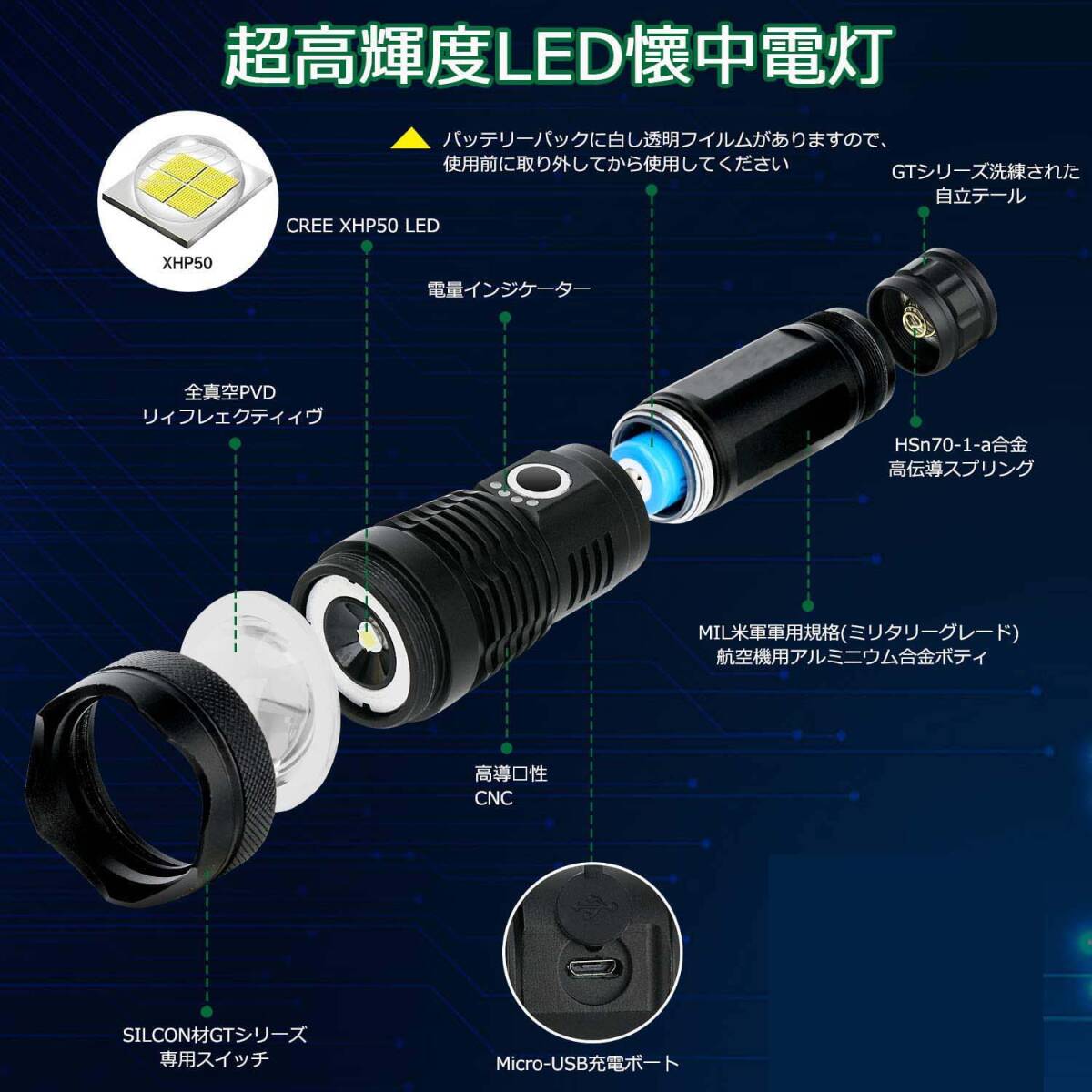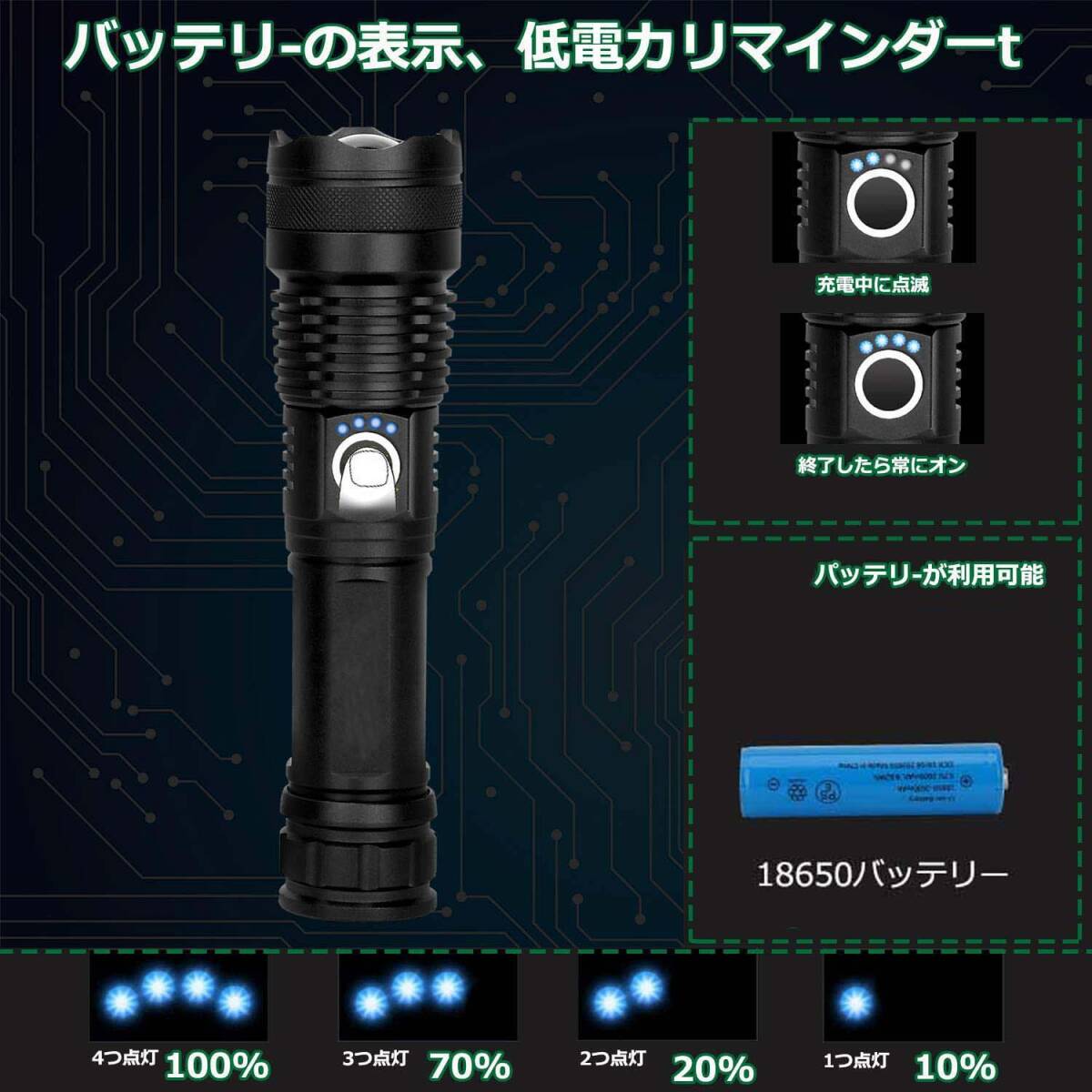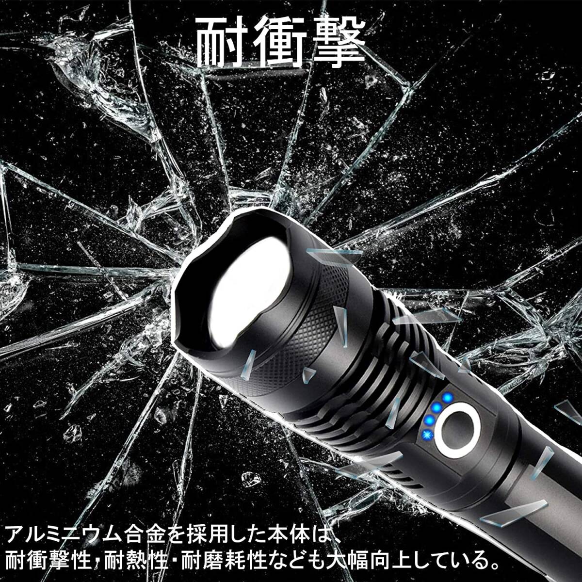 【2点セット】懐中電灯 充電式 LEDライト 超高輝度 合金製 5モード調光 18650付き