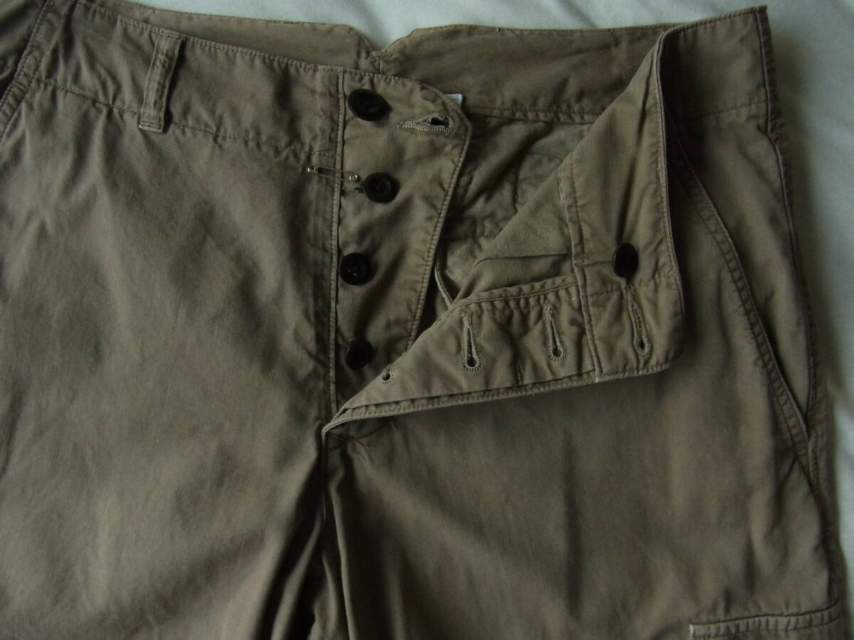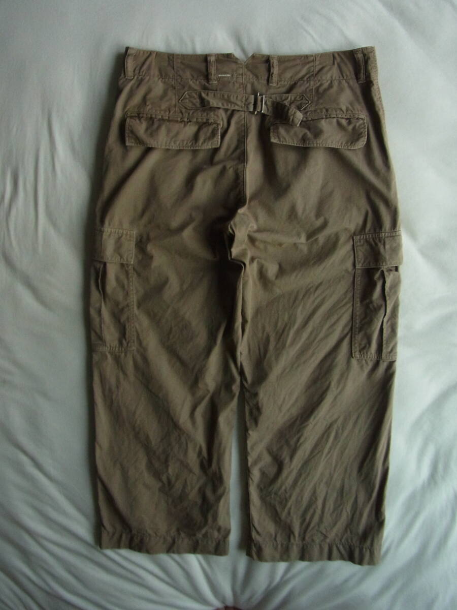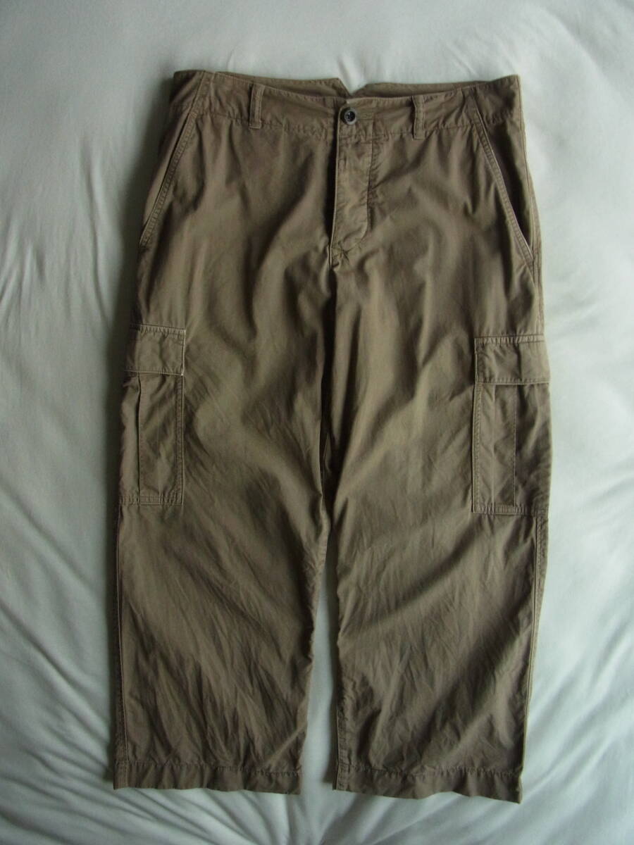 M H L.  マーガレットハウエルのワイドシルエットでクロップド丈、シンチバック付きのカーゴパンツになります。USEDで着用感と多少の色褪せ、フロント開きのボタンの付け糸に緩み(7枚目の画像)と右裾の内側に8枚目の画像の様な傷の箇所が御座います。