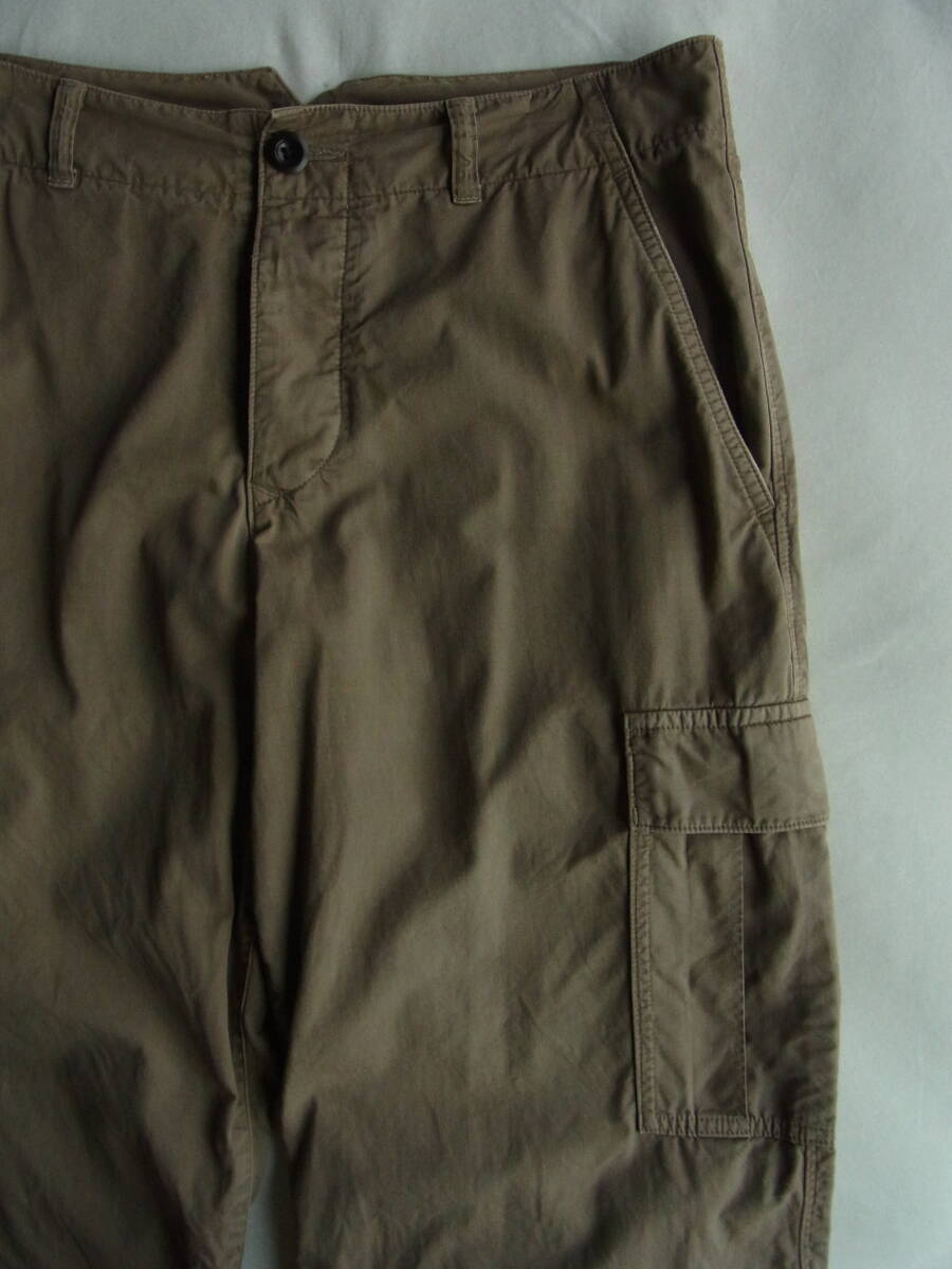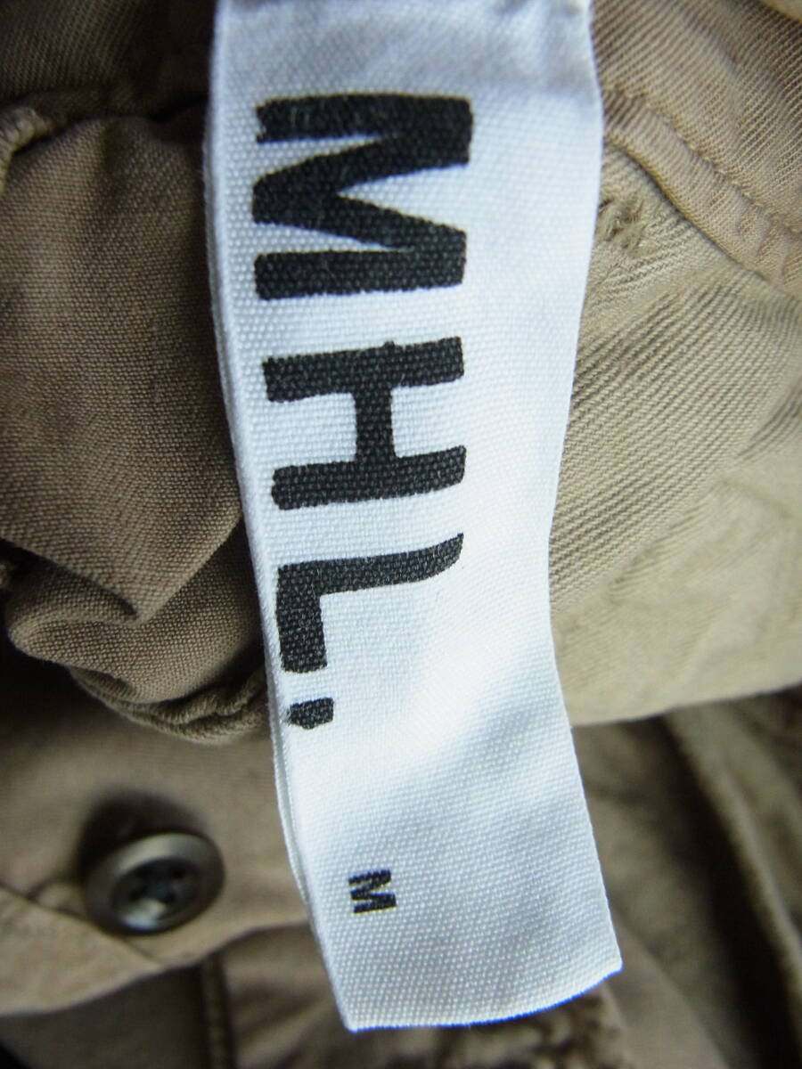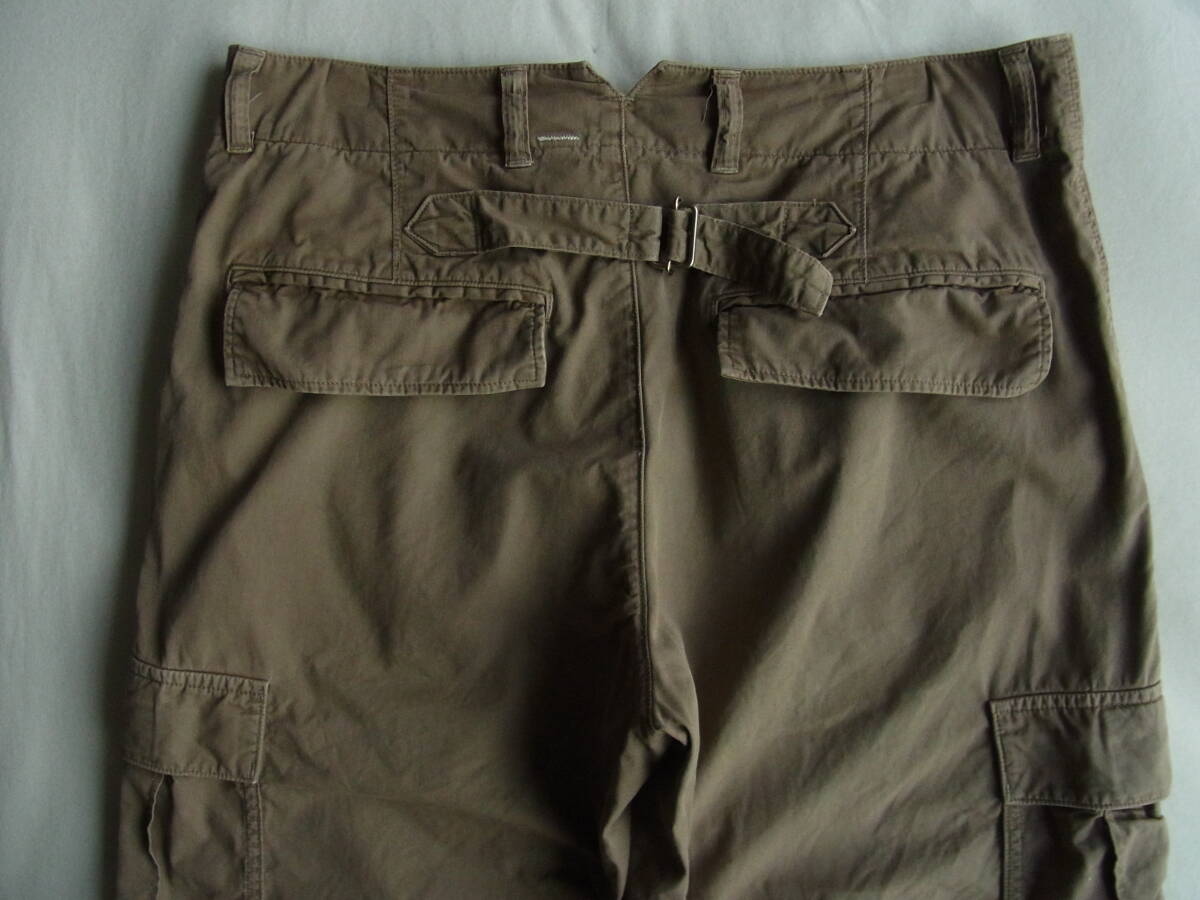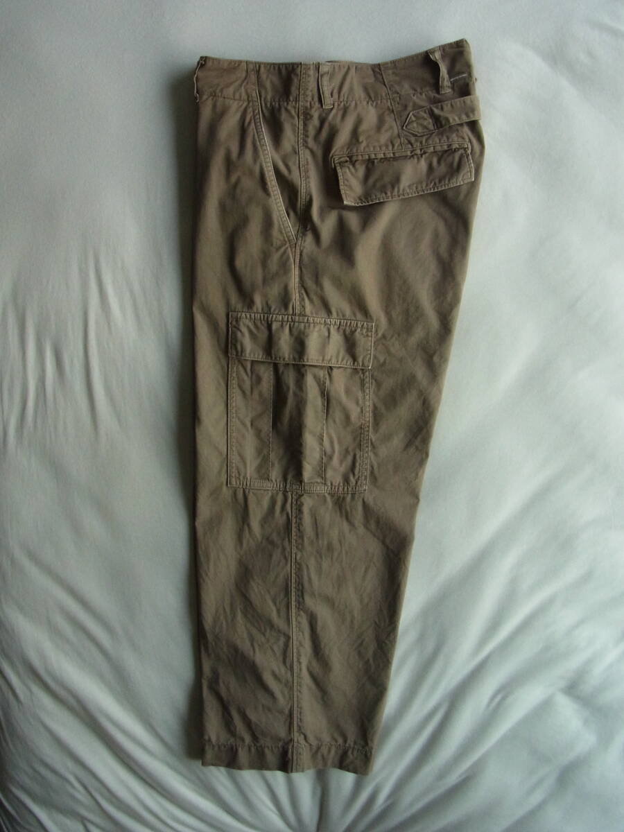 M H L.  マーガレットハウエルのワイドシルエットでクロップド丈、シンチバック付きのカーゴパンツになります。USEDで着用感と多少の色褪せ、フロント開きのボタンの付け糸に緩み(7枚目の画像)と右裾の内側に8枚目の画像の様な傷の箇所が御座います。