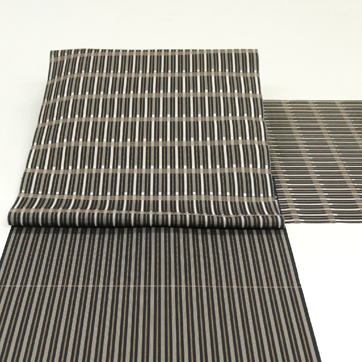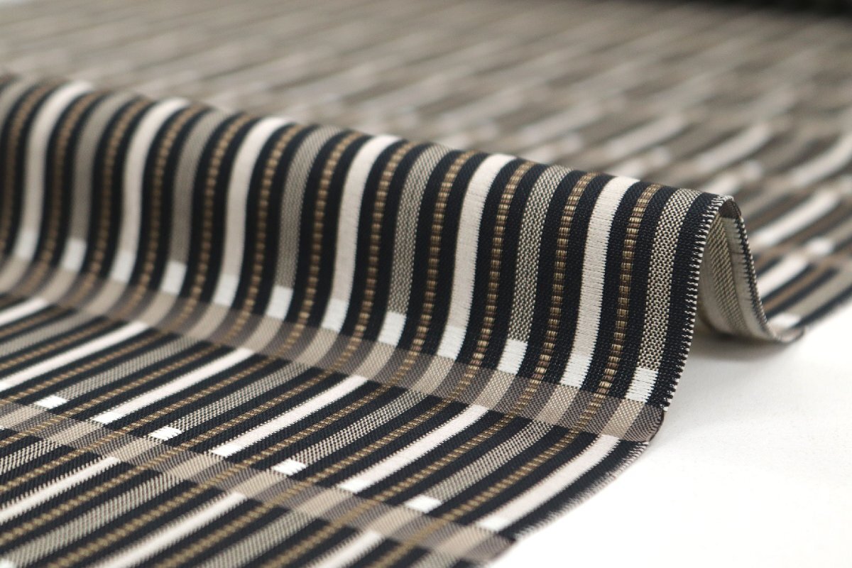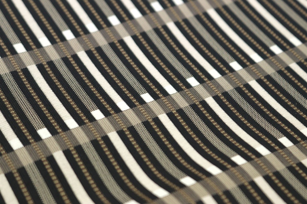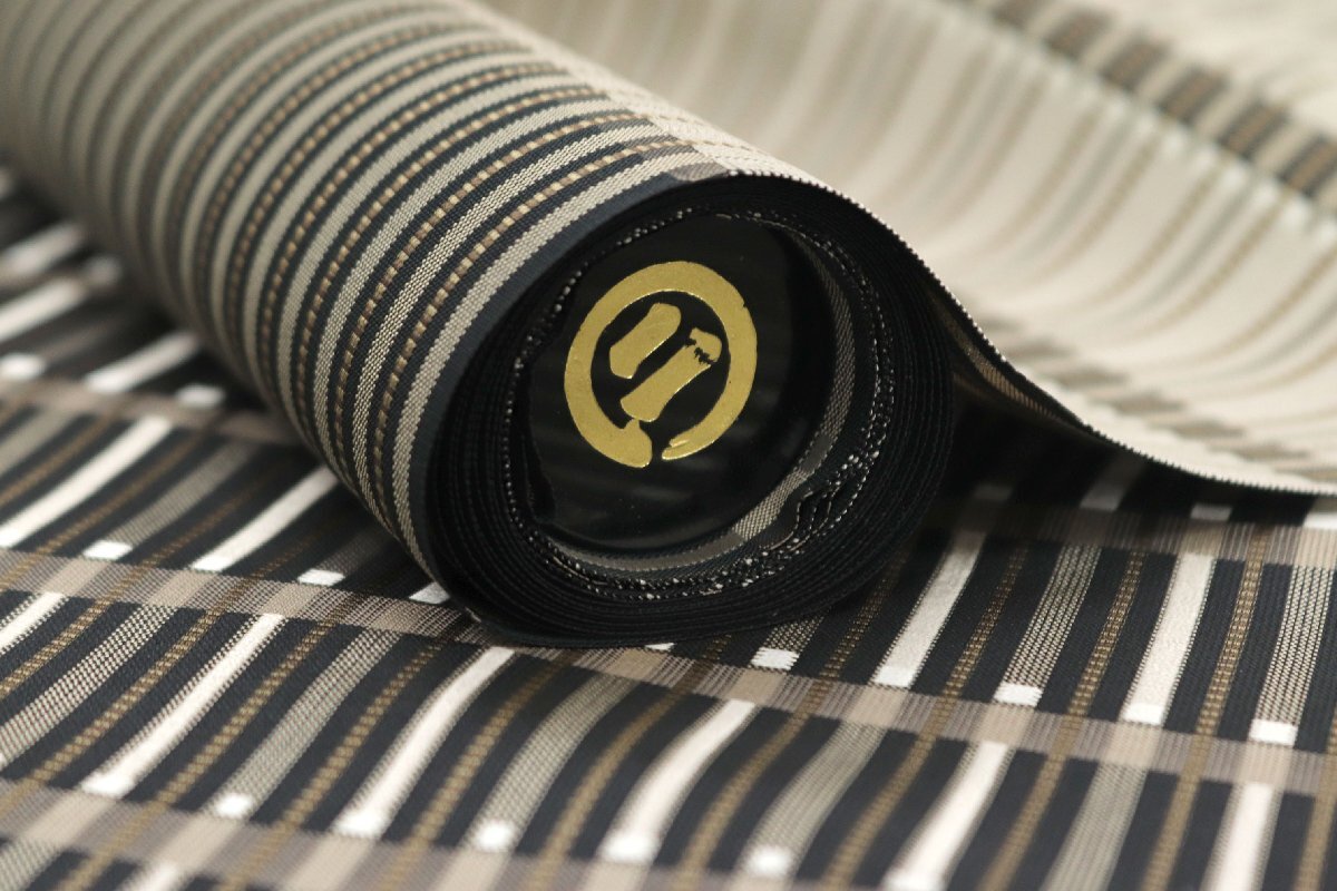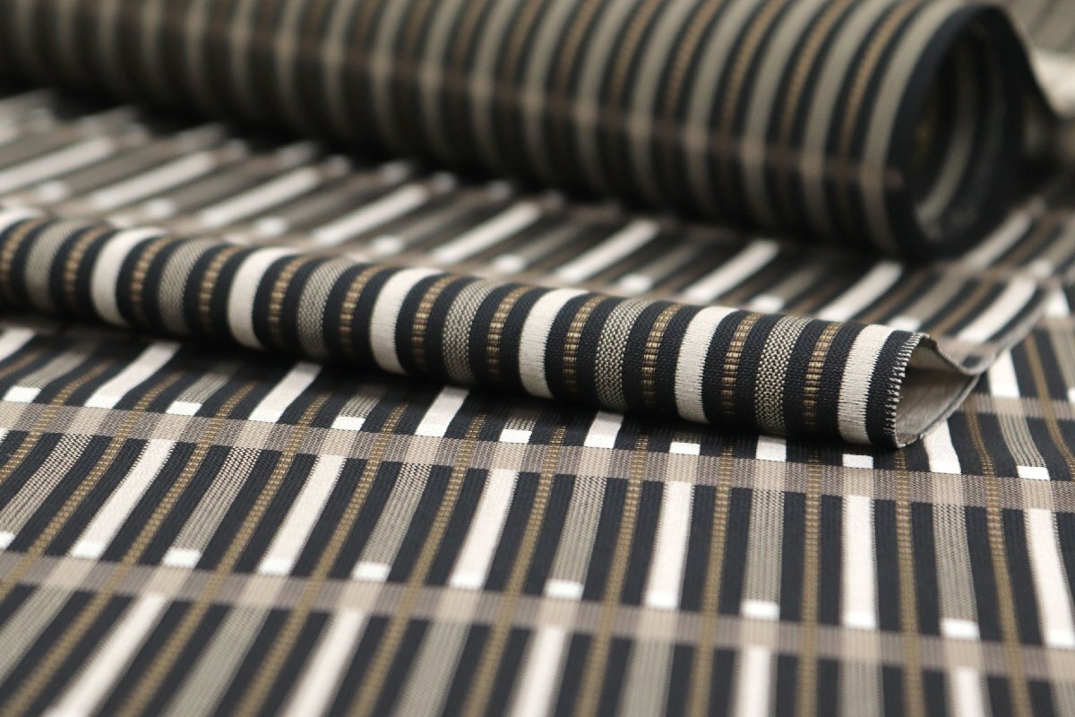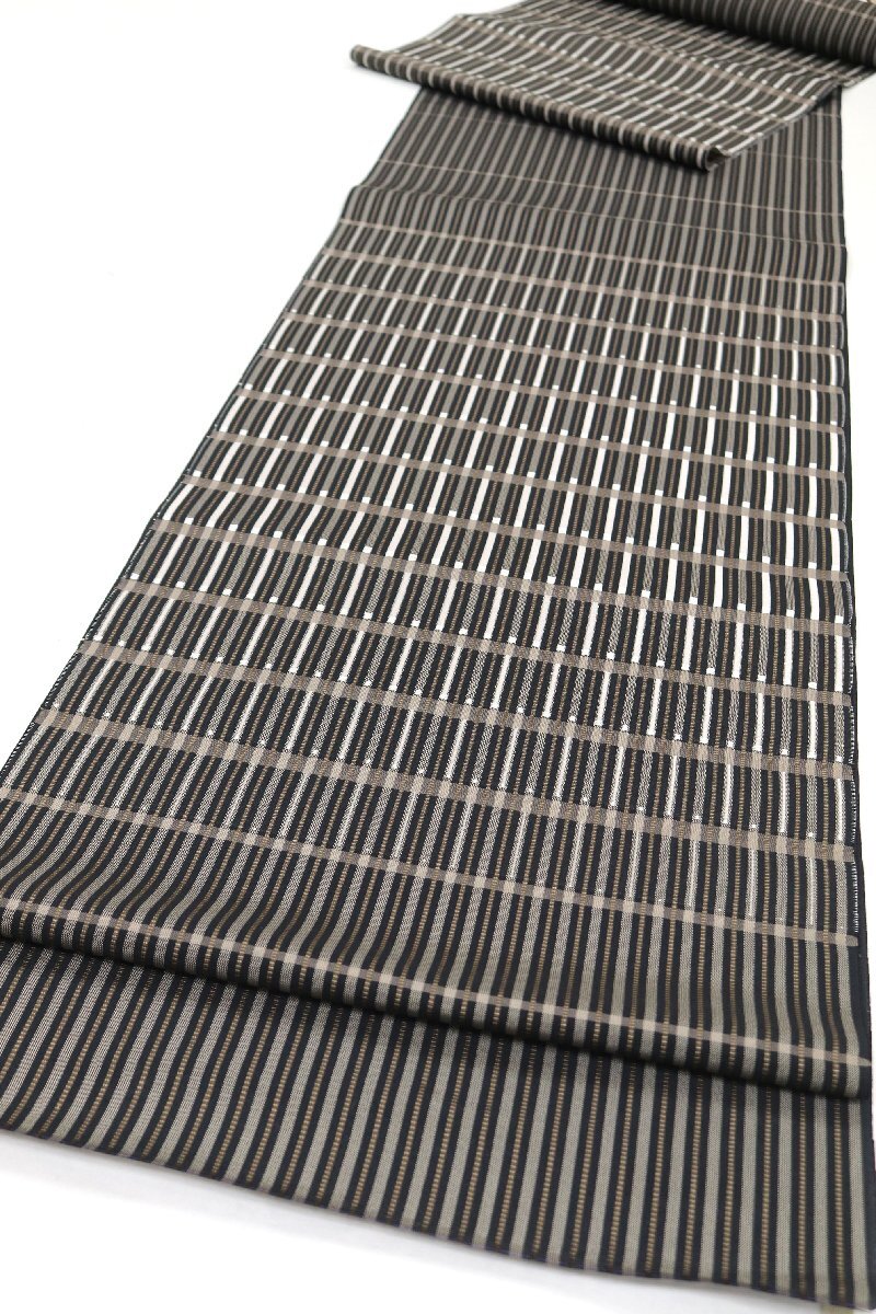 しなやかな帯地は、黒色、焦げ茶色、グレージュのお色目で、ストライプが表現されております。