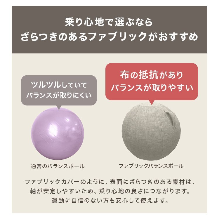 インテリアに馴染むバランスボールです!! まるでソファのような質感のファブリックカバーと優しい色合いが お部屋に馴染みます。 お洒落なのでリビング、オフィス等、置く場所を選びません☆ 女性でも簡単に持ち運べる軽さ&ハンドル付きで、 片付け・移動もラクラク! 男性でも気兼ねなく使用できる耐荷重200kg。 また、2重構造でボールの破裂を防ぎます! カバー取り外し可能で、手洗いできます。 ご自宅でお手入できるので、いつでも清潔な状態でご使用いただけます。 空気入れポンプが付属しているので、届いてすぐ使えます♪ 椅子やオットマンとしても使えて大活躍、間違いなしです! 【商品詳細】 商品内容:インナーボール、カバー、空気入れポンプ カラー: ベージュ サイズ:(約)直径65cm 重さ:(約)2.6kg 耐荷重:(約)200kg 素材(ファブリックカバー):ポリエステル 素材(インナーボール):PVC 【注意事項】 ・商品は、モニターによって色合いが異なって見える場合があります ・仕様/デザインは改良のため予告なく変更することがあります |