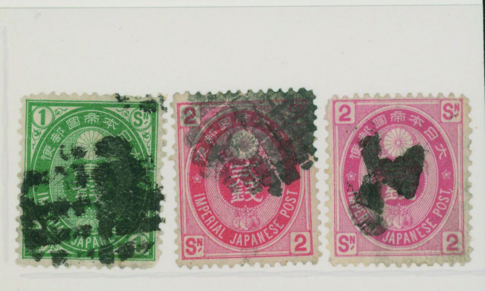 商品説明:[41066] U小判1銭, 2銭2枚 済 白抜格子 無声印(3枚プロペラ) 白抜格子は外国局パックボー印
