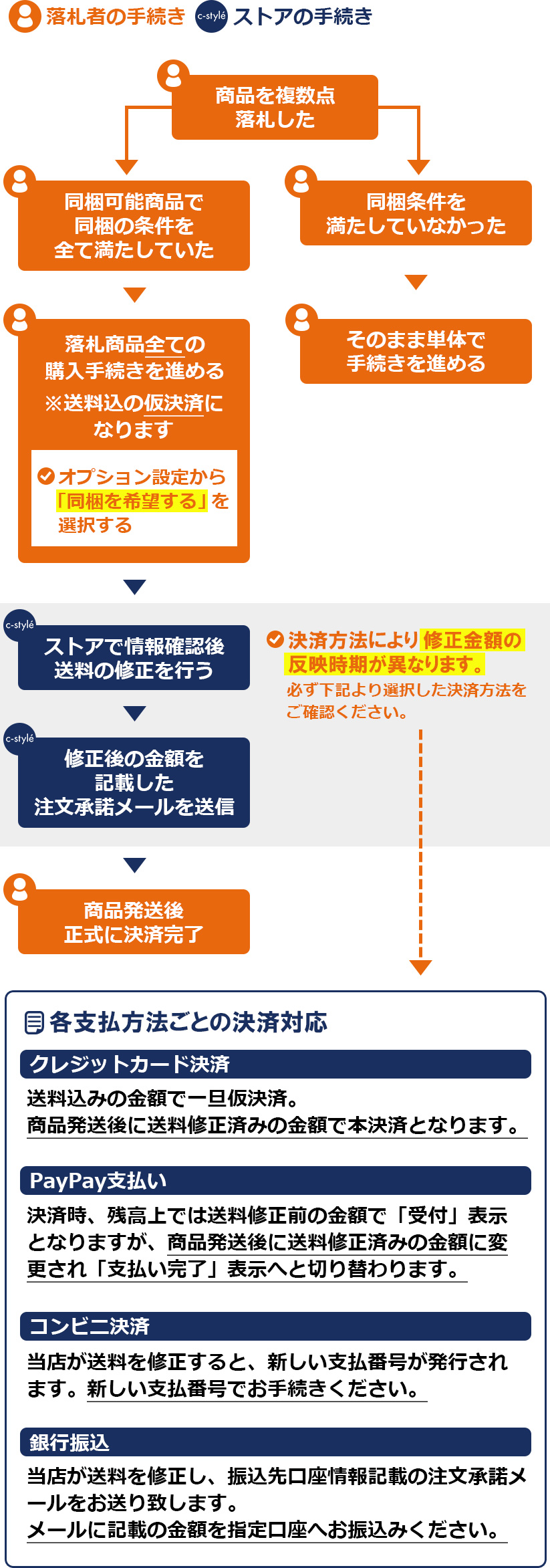 | ①取引ナビからお届け先情報の入力をお願いします。 ご購入の確認メールが届きますので記載URLよりお手続き下さい。 ②落札価格に消費税が加算されます。 ストア出品の為、落札価格に消費税が加算されます。 ③商品発送の目安 ご入金が確認でき次第、3営業日以内に商品を発送させていただきます。 (土日祝日の商品発送は行っておりません) ④同梱商品落札時の決済の流れ