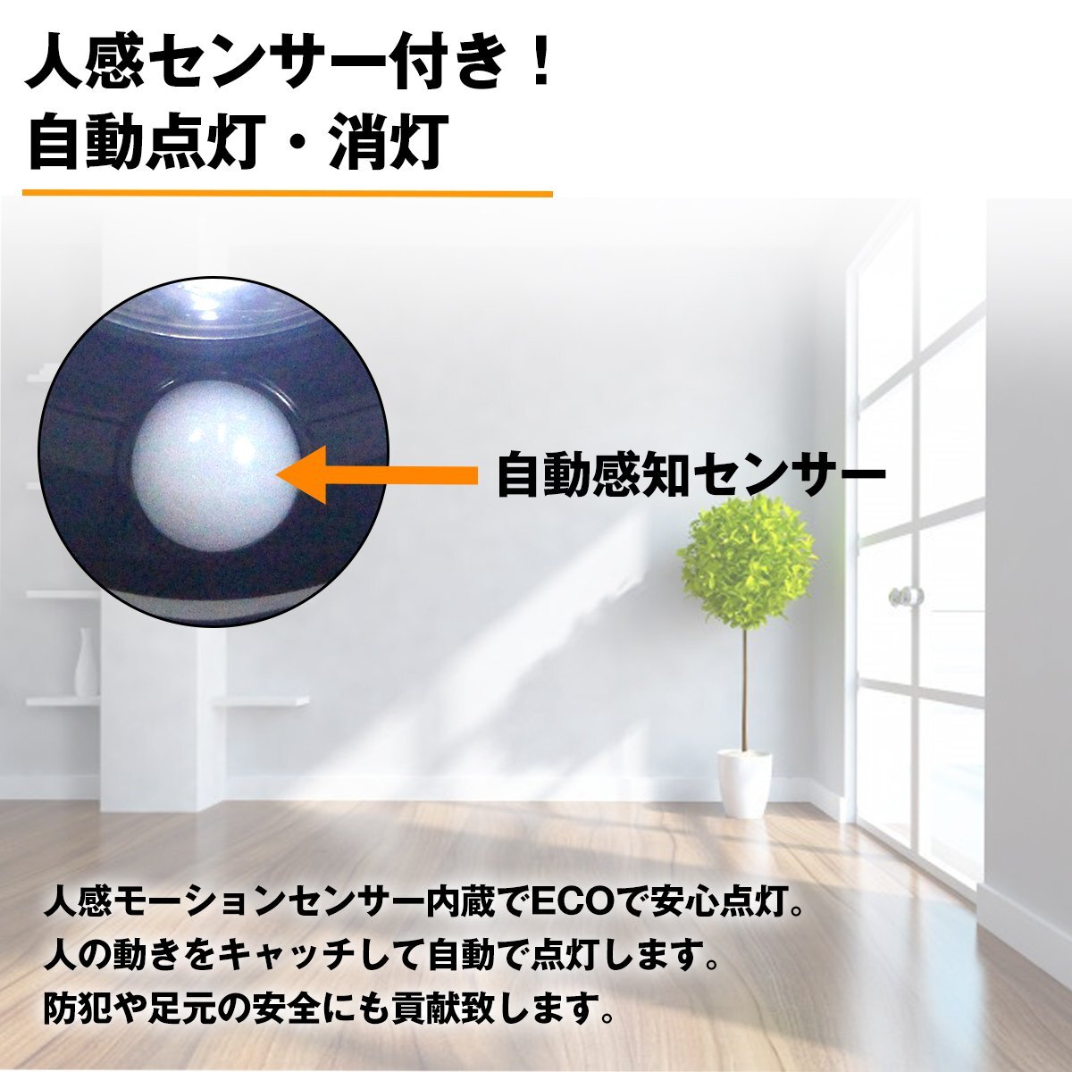 人感センサーを内蔵しており、人が通ると自動点灯します。