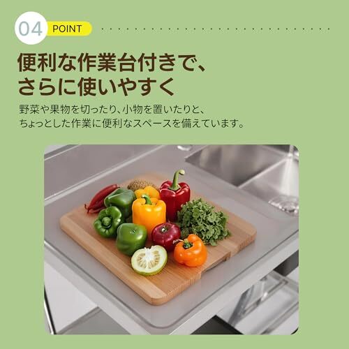 【便利な作業台と収納棚】流し台の横には便利なスペースが設けられており、野菜や果物を切ったり、小物を置いたりするなど、簡単な作業を行うのに便利です。流し台の下には収納棚が装備されており、洗剤や洗い物用品をすっきりまとめて、省スペースで保管できます。収納棚の周りに仕切りが無いので広々とお使いいただけます。