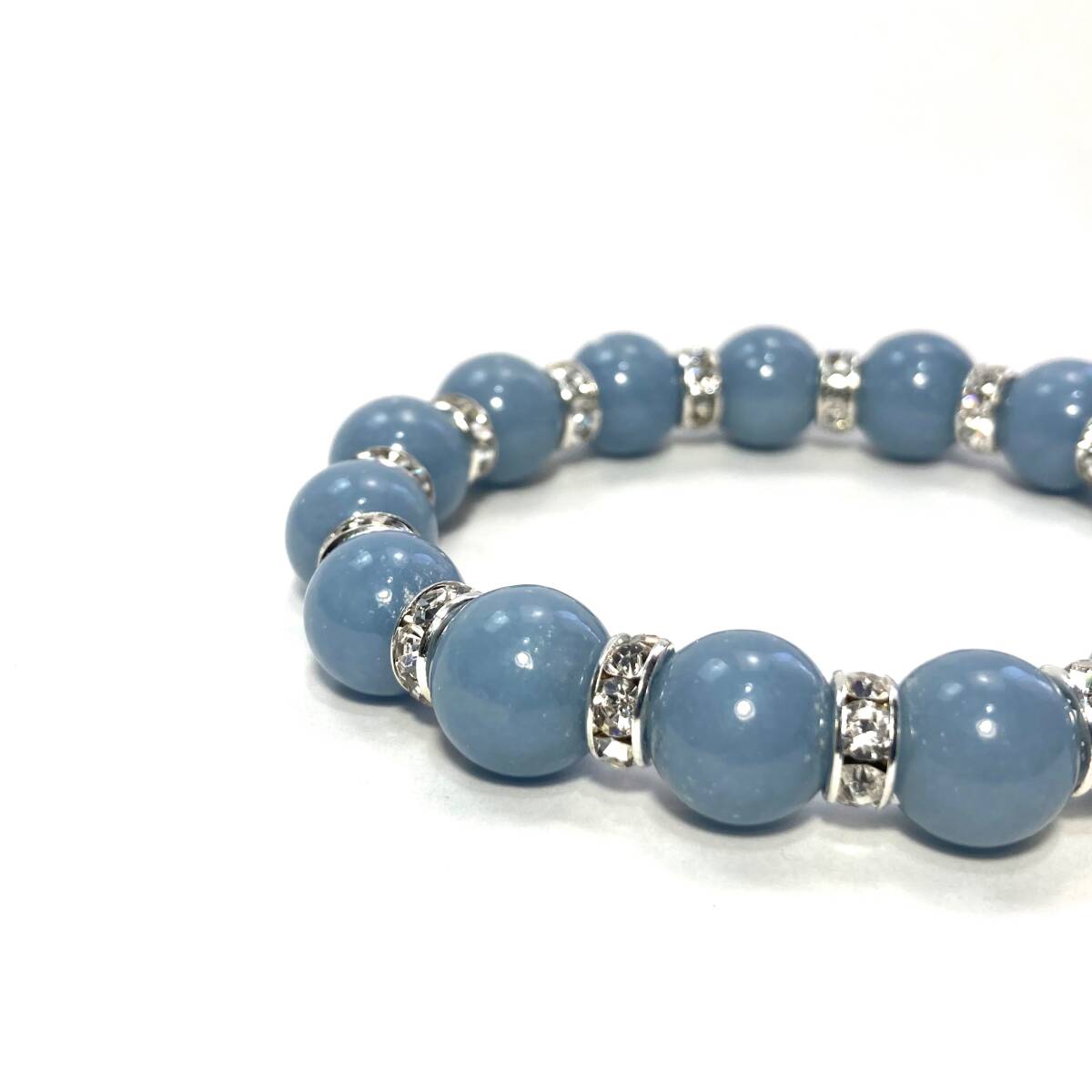 こちらは、12mm玉のエンジェライトを使用した天然石ブレスレットです。石との間にはロンデルを挟み高級感を演出しています。シンプルなデザインですのでどんなコーディネートとも合わせ易いブレスレットです。石大きさは12mm玉です。内径約18cmです。(サイズ調節も無料で承っています。サイズ変更の場合は購入後、メッセージをお願いします) 数に限りがございますので気になる方はお早めにどうぞ。
