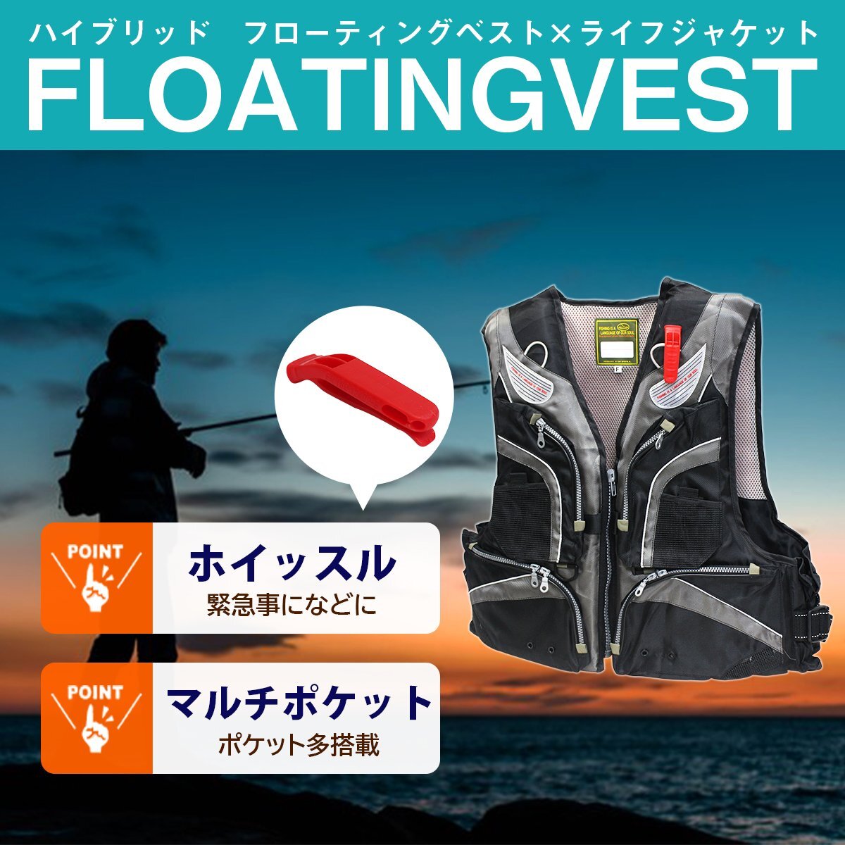 フローティングベスト ブラック 救命胴衣 釣り ベストタイプ 浮力脱着可能 ライフジャケット フィッシングベスト ポケット付き