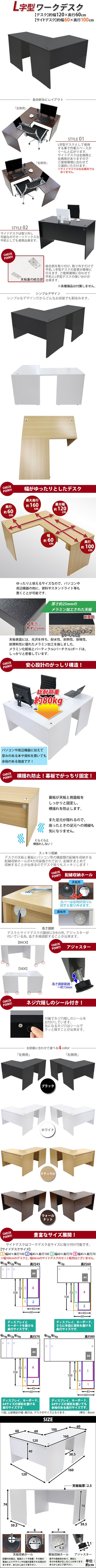 | 商品紹介 | ■作業スペースを広く確保出来る、L字型ワークデスクです。 ■サイドデスクの幅が約60cmのタイプです。 ■会議室や事務所等、オフィス家具として様々なシーンでお使いいただけます。 ■天板には、メラミン加工を施しています。 ■幕板が天板と側面板をがっちりと固定!横揺れを防止します。 ■ネジ穴隠しのシール付き。 ■デスクの天板と幕板に配線収納ホールが2カ所ずつ備わっています。 ■アジャスターで高さの調節が可能です。(高さ調節範囲〜約15mm) ※こちらの商品は、組立て式です。組立てにはプラスドライバーが必要です。お客様でご用意ください。 ※組立図が付属します。 ※サイドデスクの取り付けはデスクの右側専用となります。 ■材質:パーティクル(パーチクル)ボード(メラミン加工)(本体、サイドデスク)、プラスチック(アジャスター、配線収納ホール) ■重量:約50kg(デスク:約29kg、サイドデスク:約21kg) ■総耐荷重:約80kg ●新品商品ではありますが、輸入商品の為、多少の擦り傷などがある場合がございますので、ご納得の上ご購入下さいませ。 ●ご購入後、お客様ご都合によるご返品、ご返金等は一切お受け致しておりません。 ●本商品を使用した際に発生したトラブル、事故につきまして、当社は一切の責任を負いません。ご使用に関しましては、全て自己責任にてお願い致します。 ※カラーはブラックとなります。 |