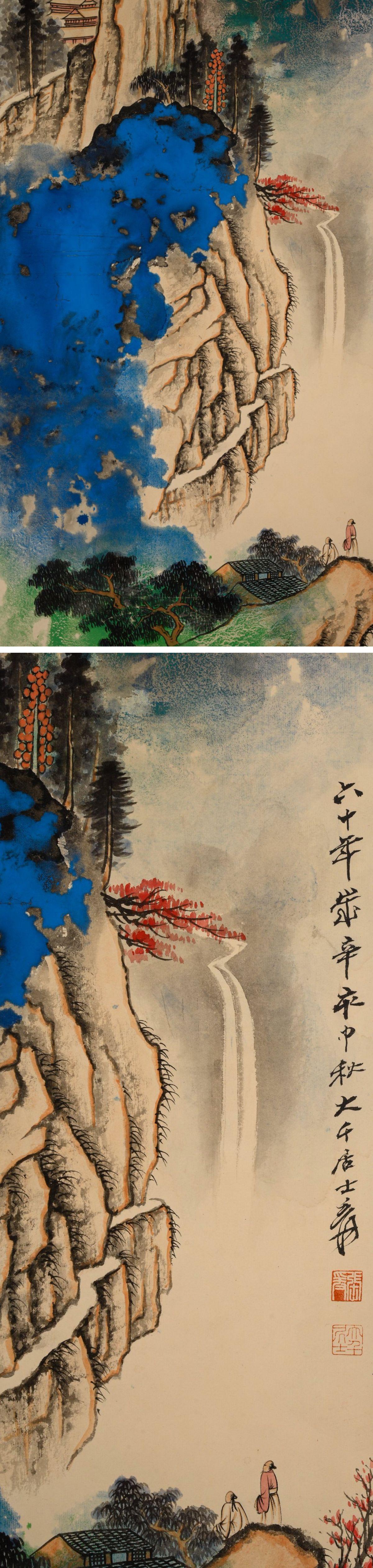 【清】某有名オークション買取「張大千書」中国書者 紙本【溌彩山水図・三対幅掛軸】肉筆保証 巻き物 中国畫 中国書道7L12-UL