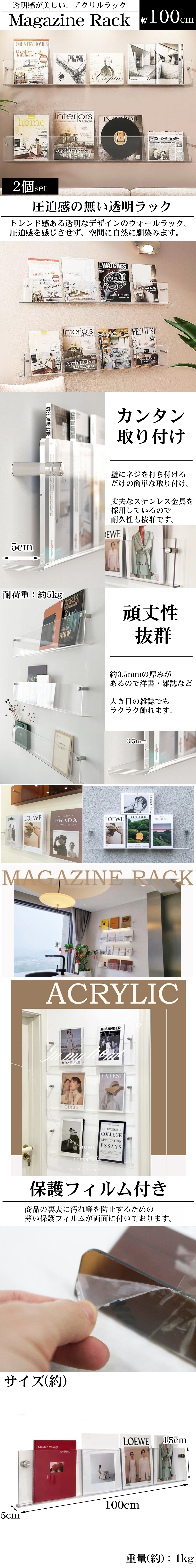 ウォールラック 壁 マガジンラック 2個set 幅100cm アクリル レコード 収納 ディスプレイラック 収納ラック 薄型 ins風 透明 WP-67CL