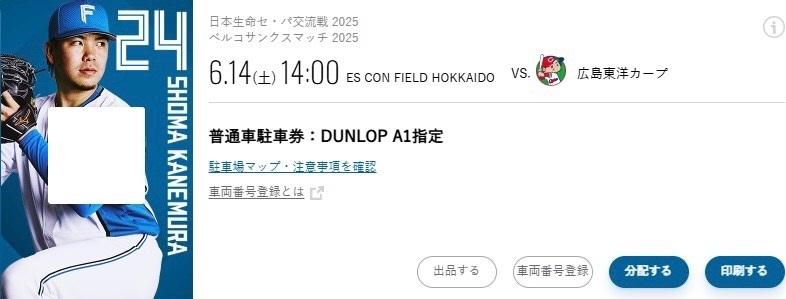 エスコンフィールド 駐車券 A1 日本ハムファイターズ 6/14 6月14日 交流戦 広島戦