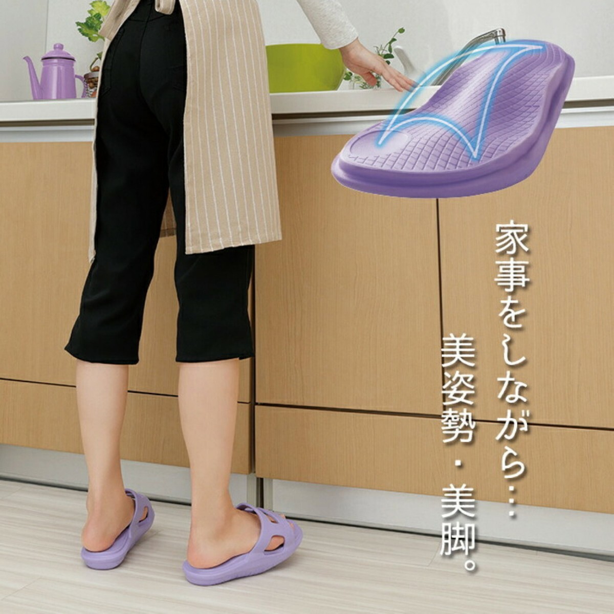 足底部分に角度がついている為、重心を後ろに意識させ下腹、ヒップ、ふくらはぎを鍛え、美しい立ち姿勢に導きます。