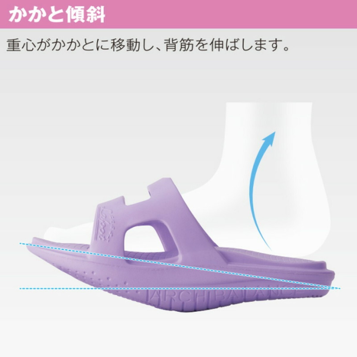 ・※「かかと傾斜」:約7°の傾斜で、重心がかかとに移動し背筋を伸ばします。また、脚の筋肉を刺激します。