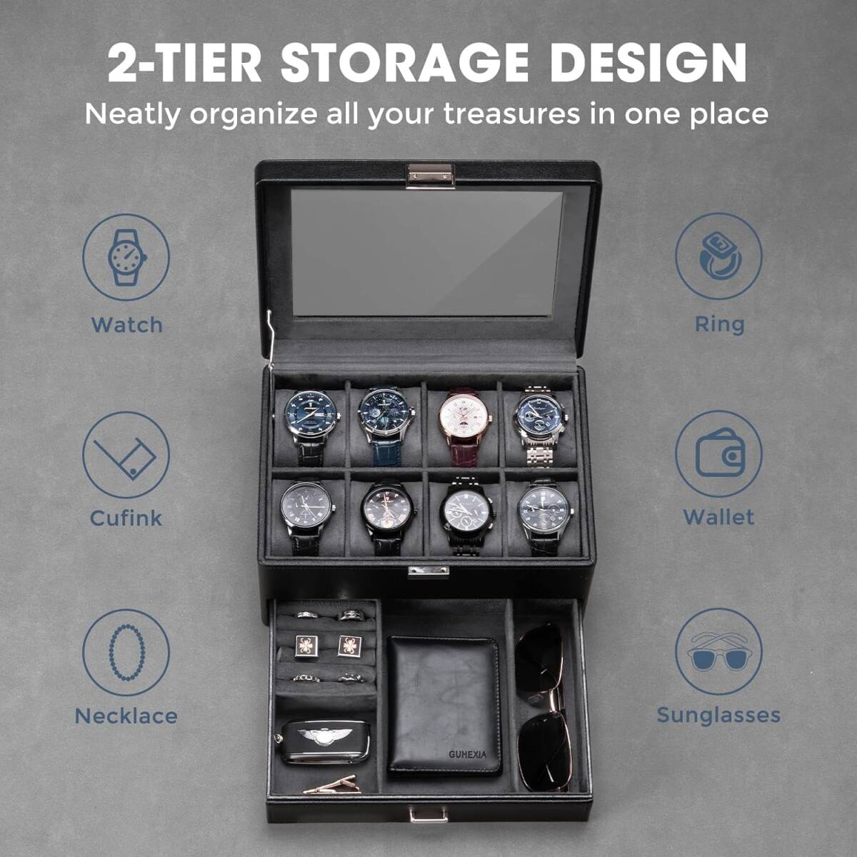 2段式の腕時計ケースで、上段には8本の時計を収納可能。