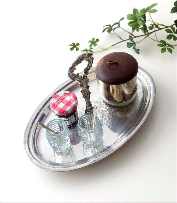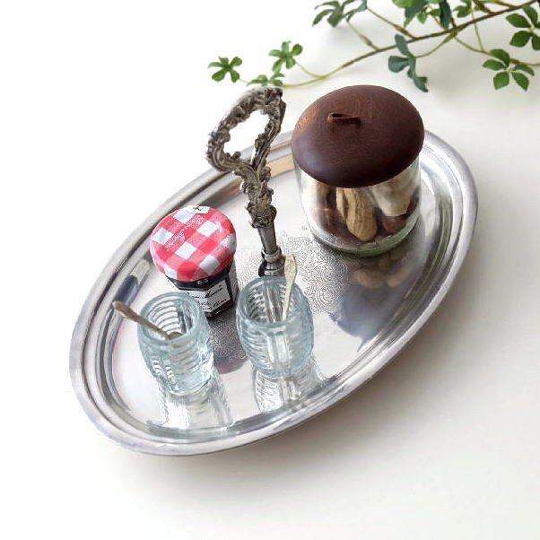 | 鈍い輝きが魅力のホワイト真鍮 レトロな風合いは そこにあるだけで おしゃれ空間になりそう。 凝った持ち手付きのハンドルトレーは 食卓でスパイスやジャムなどを置いたり ミラーの前に置いて 小物やアクセサリー置きにも。 商品名 : ハンドル付き シルバートレイ 商品番号 : ebn6232 全体サイズ(cm) : 幅25×奥行16.5×高さ15 トレイ内サイズ : 幅20.5×奥行13 材質 : 真鍮 重量 : 460g 生産国 : インド ※お客様による簡単な組み立て品です ※商品の特性上、小傷や擦り傷、色ムラや凹み、僅かながたつきなどが見られます ※真鍮は空気中の成分と反応して黒ずんだりする性質があります。使い込んでいく中で特性の一つとして、ご理解ください ※ディスプレイによる色の違いはご了承下さい |