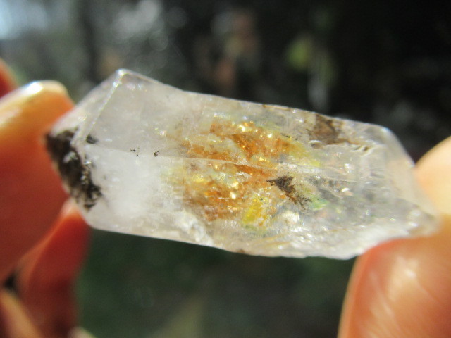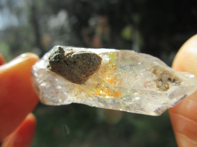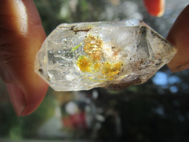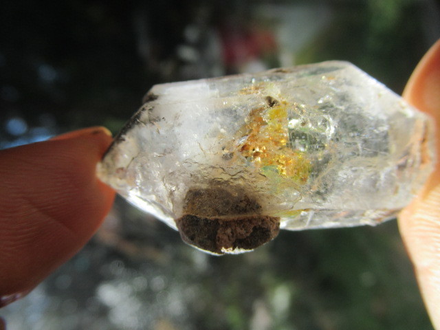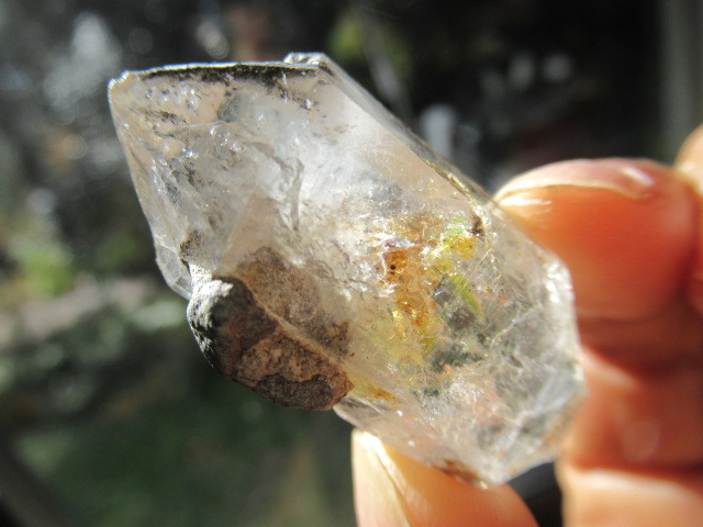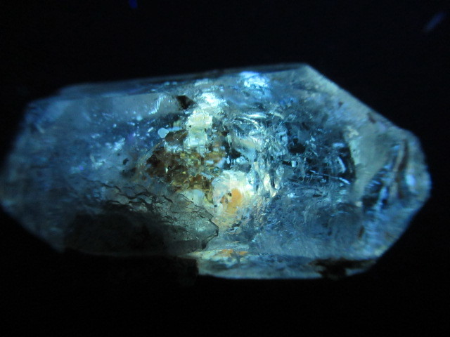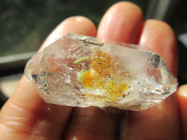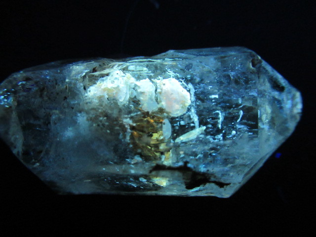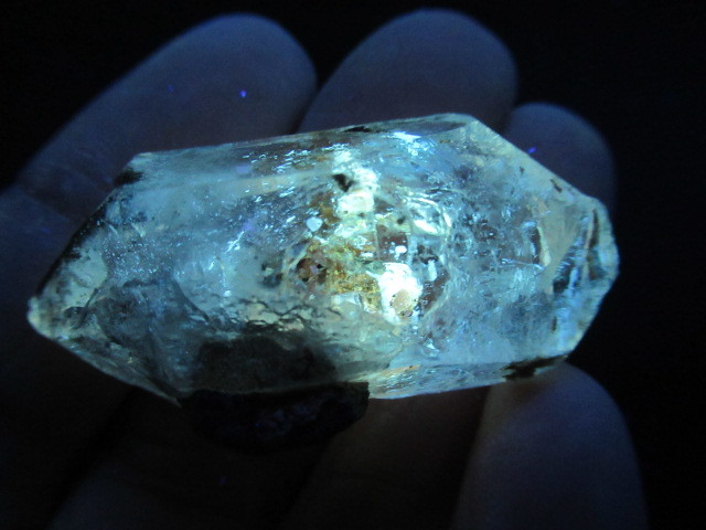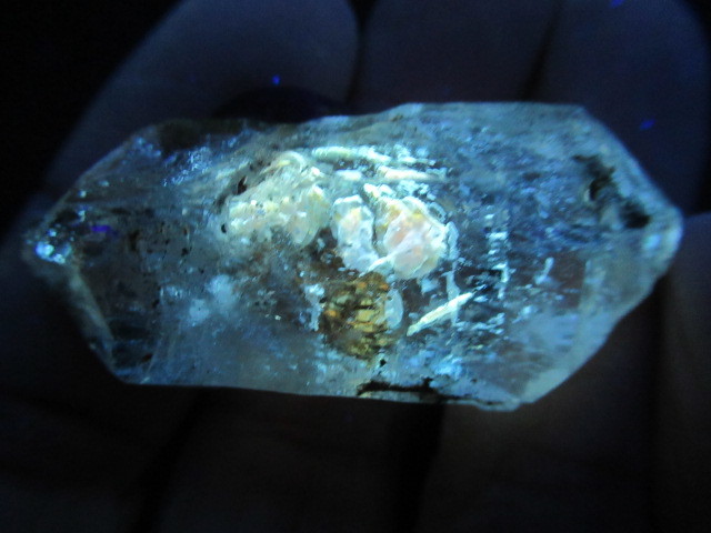 パキスタンWaziristan産の蛍光性の石油成分を内包したいわゆるオイルクオーツ。サイズ長さ44mm辺・辺太さ19/13mm、重さ15,3gとオイルクオーツとしてはかなり大きめで、15x6mmほどの石を半分ほど取りこんでいます。その石が一般的な母岩と違い露出部分の角が摩滅と思われる丸味がある一方で水晶本体の稜には摩滅が見られず奇妙です。水晶は両錐で柱面の横筋成長丘もはっきりしています。蛍光性オイルは中心部に集中しています。送料無料。