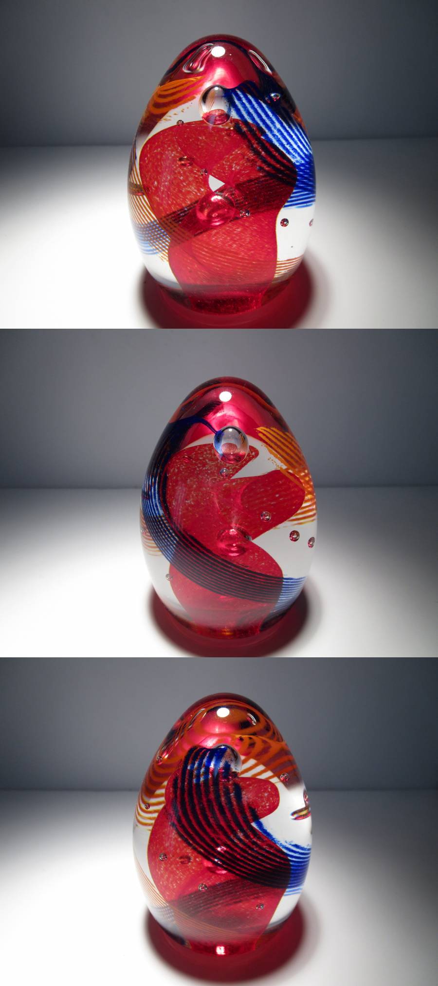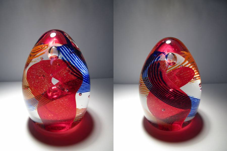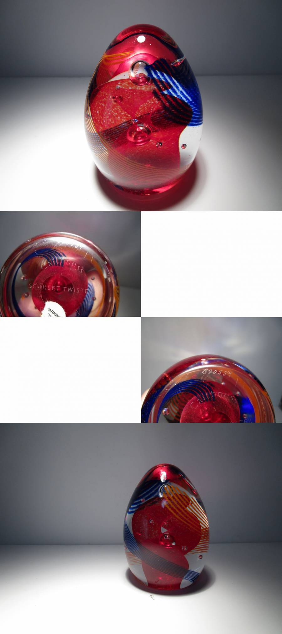 Scarlet Twister(深紅の竜巻)という名の作品。卵型のフォルムの中に封じ込められた、作品名の通り、深紅色とコバルトブルーで彩られた竜巻を模ったと思われる螺旋模様が印象的な1品。色合い、全体のデザインいずれもケイスネスらしい有機的なナチュラルさと幻想的な印象を兼ね備えた良品だと思います。