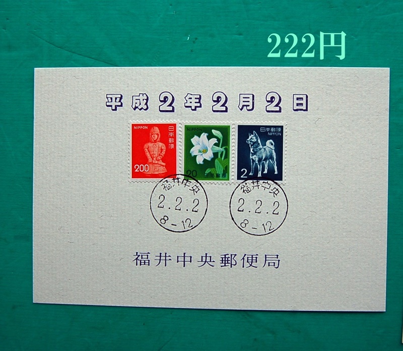 平成2年2月22日  額面合計:ハガキ82円 切手266円 です。