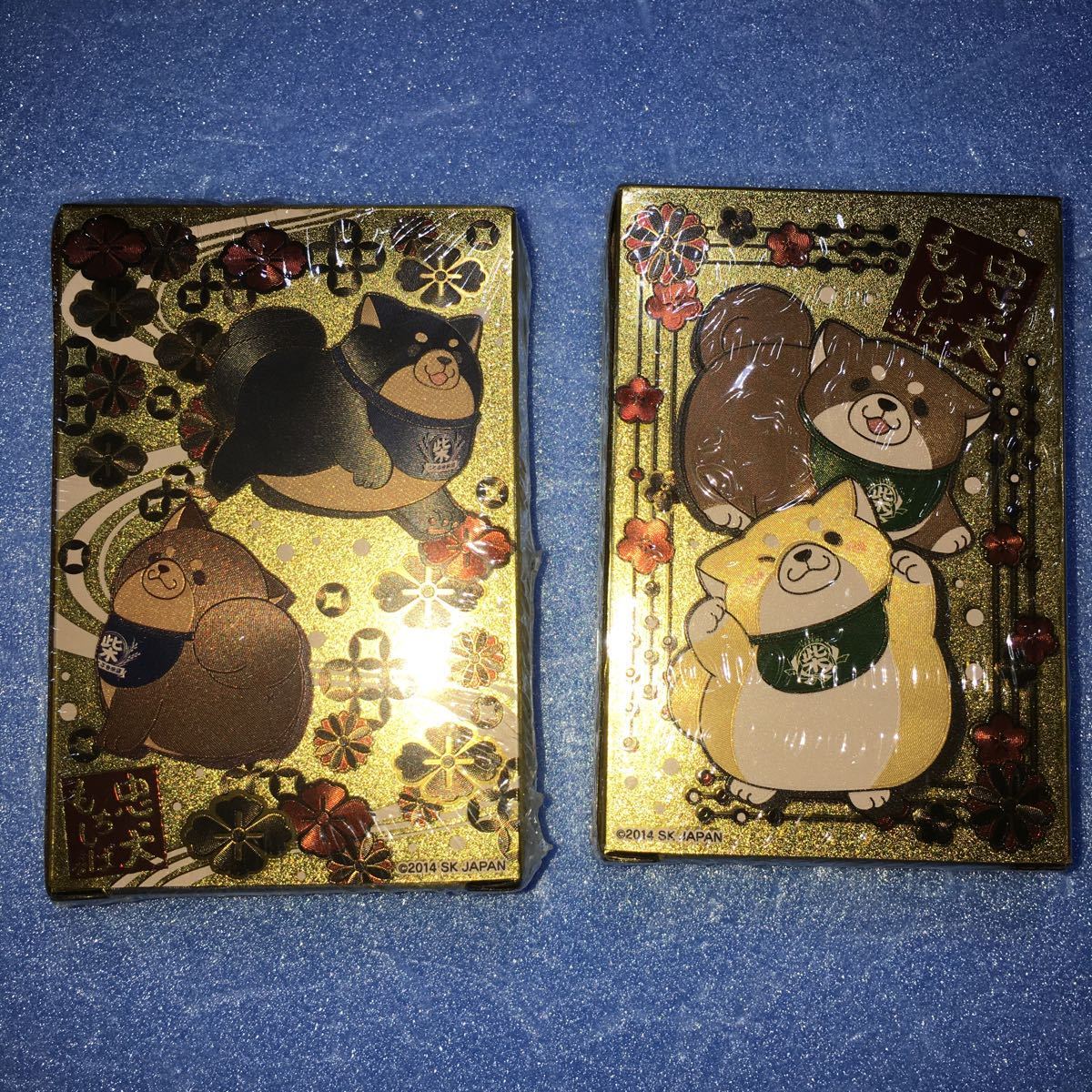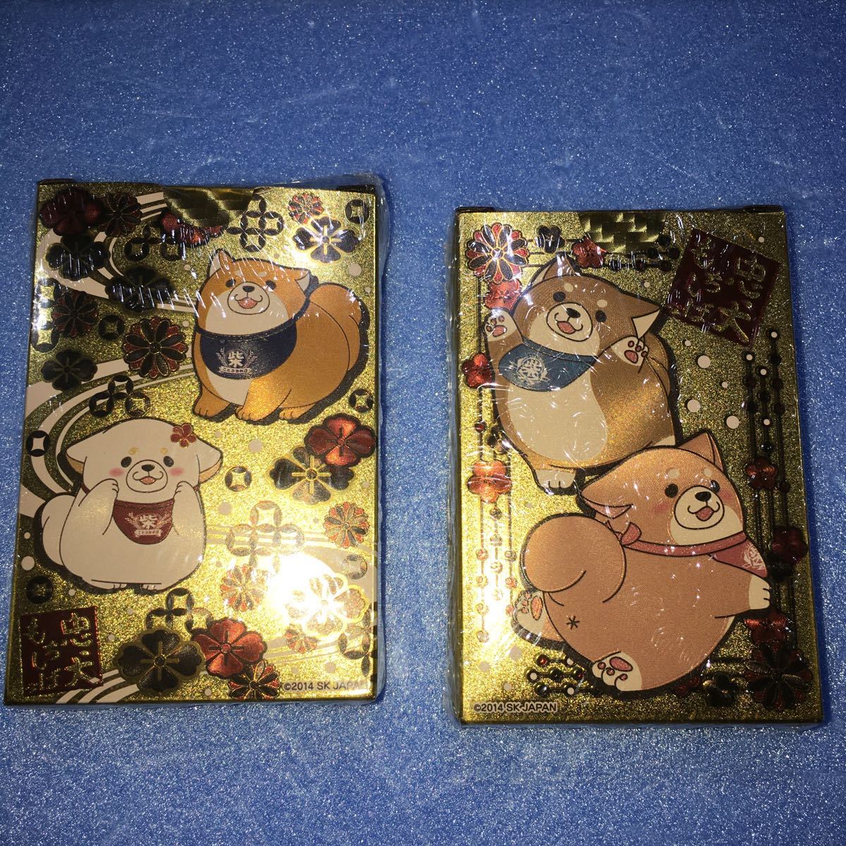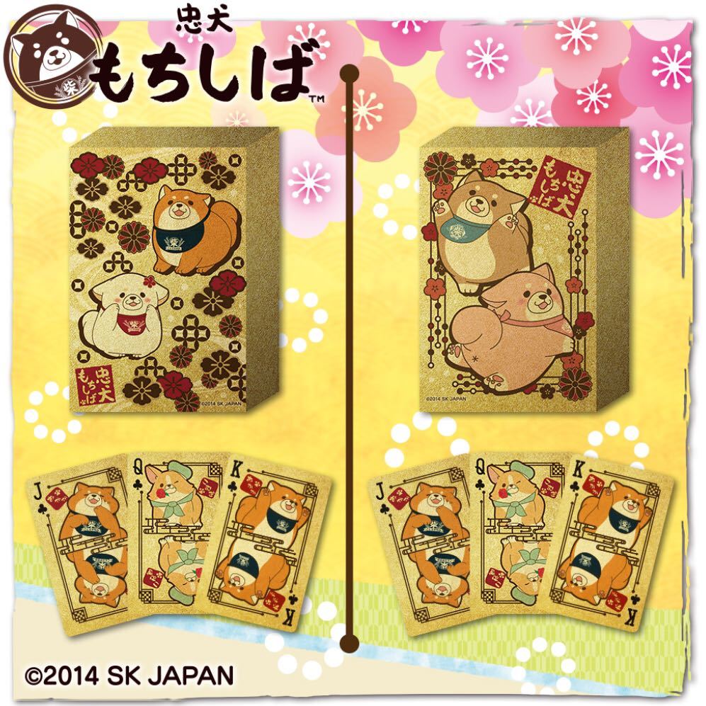 忠犬もちしばより、キラキラ輝くゴールドトランプが登場!表側の絵柄は共通で、BOXと裏面デザインが異なる「ことぶき米店」「うえまち団子店」の2種展開。全てトランプ用の描き下ろしデザインとなっております。「やまと」や「ふてどり」等の新キャラクターも加えたオールスターデザインは必見です