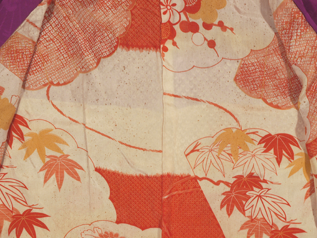 やや沈んだ濃いめの紅紫色の地に檜扇(ひおうぎ)散らしの地紋が織り出された紋綸子縮緬の羽織です。袷仕立てです。 現代のものにはないお色目がアンティークならではのしっとりとした華やかを醸しています。やわらかな手ざわりの縮緬地です。 昭和初期ごろにつくられたと思われるアンティークのお品で、画像のとおり、羽裏に直径約 1-2mm の黄変がポツポツと全体的にあります。そのほかに目につく大きなしみやよごれ、褪色などのダメージはなく、表地はとてもきれいな状態です。 |