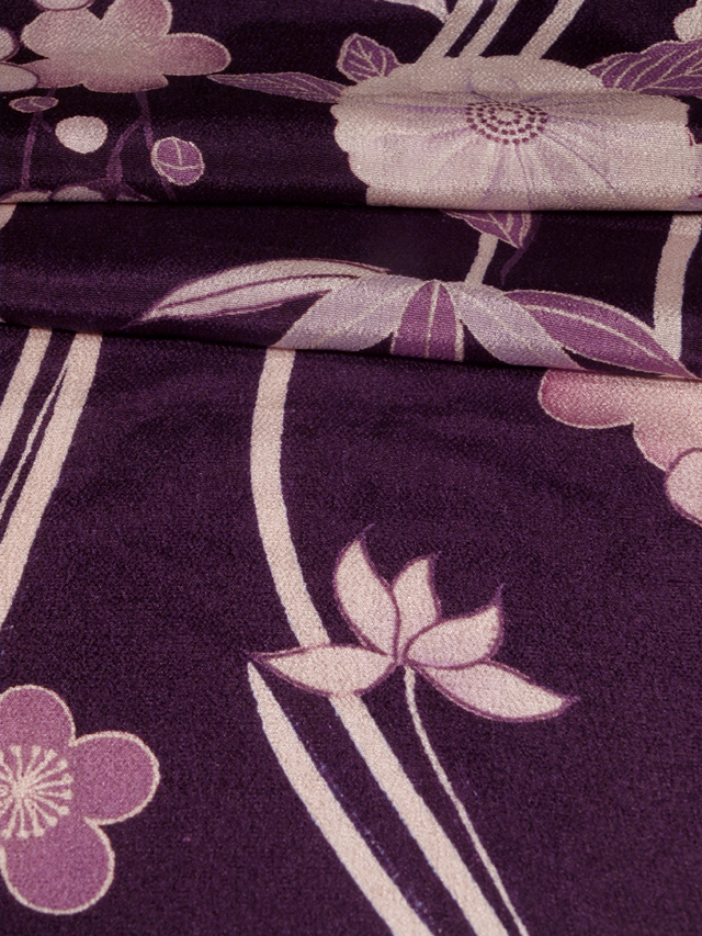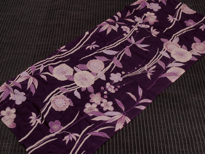 沈んだ紫紺(しこん)色の地にやぶれ菊立涌(きくたてわく)の文様が染められている、錦紗縮緬のはぎれです。 大正から昭和初期ごろにつくられたと思われるアンティークのお品です。下端から約 25cmの範囲に直径約 0.1-2mm の小穴が 7-8 か所程度あります。そのほかに目につくしみやよごれ、褪色などのダメージはなく、全体的にはきれいな状態です。※風楽の出品内で同じ柄のものを複数出品している場合もあります。 |