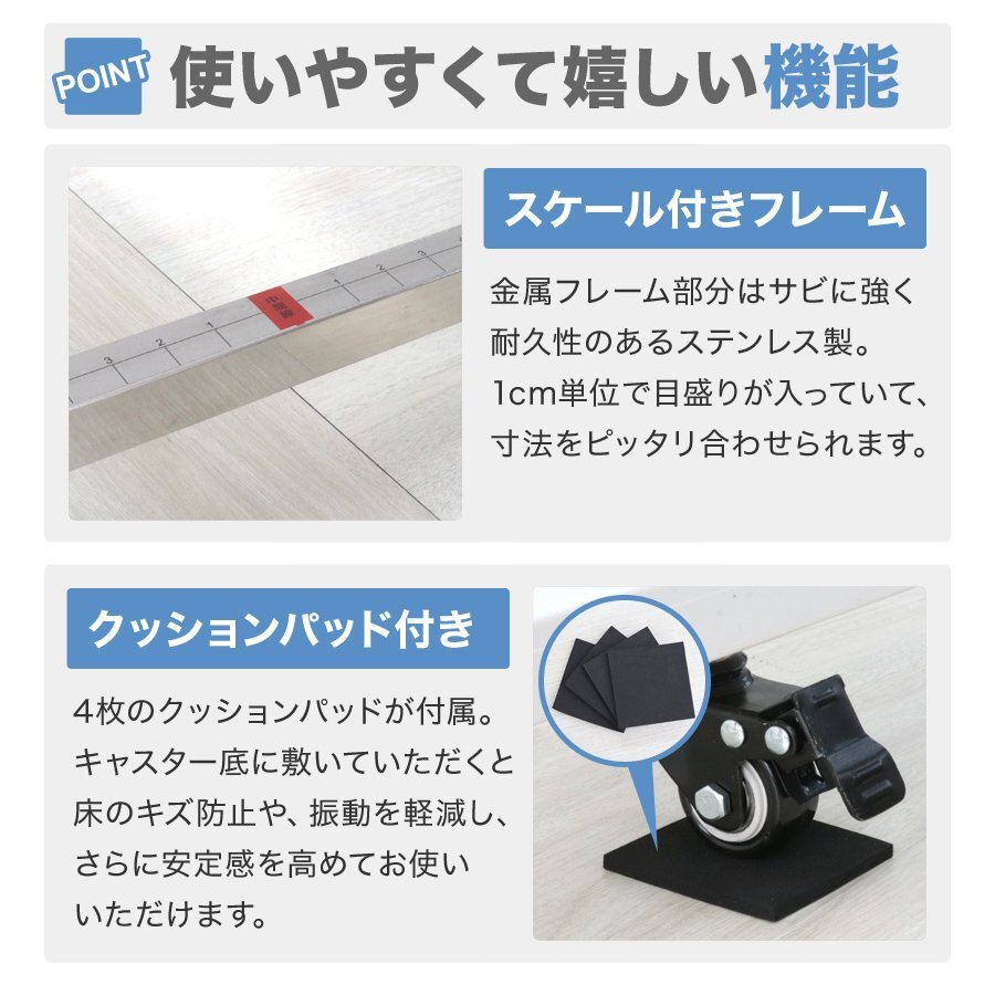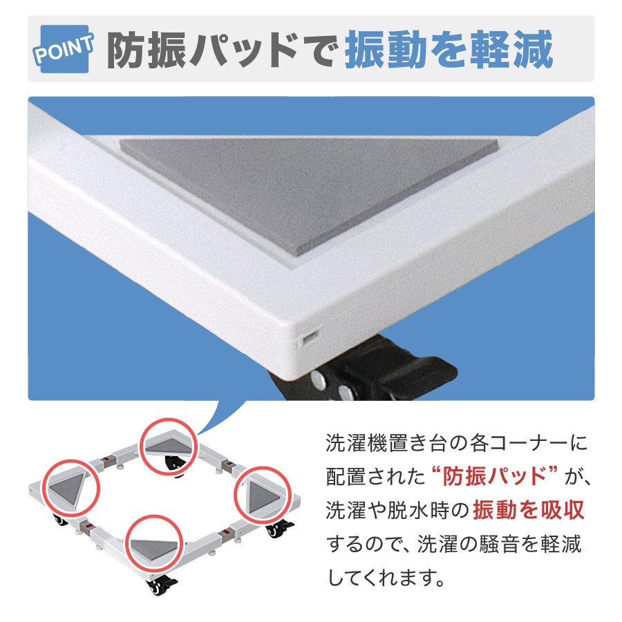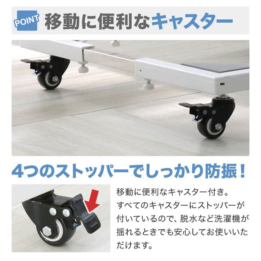いつでも簡単に洗濯機を動かすことができる、キャスター&ストッパー付きの洗濯機置台です。 かさ上げすることで、通気性もよくなり、洗濯機周りを衛生的に保てます。 ●振動パッドで振動を軽減 各コーナーに配置された「振動パッド」が、振動を吸収するので、洗濯時の騒音を軽減してくれます。 ●移動に便利なキャスター 洗濯機置台は移動に便利なキャスター付き。 全てのキャスターにストッパーが付いているので、脱水など洗濯機が揺れる時でも安心。 ●使いやすくてうれしい機能 ・スケール付きフレーム:金属フレーム部分はサビに強く耐久性のあるステンレス製。1cm単位で目盛り入りで寸法をピッタリ合わせられます。 ・クッションパッド付き:4枚のクッションパッドが付属。キャスターの下に敷くと床のキズ防止や振動をさらに軽減。 ●商品仕様 サイズ(約):幅45〜71cm、奥行45〜71cm、高さ9.6cm 重量(約):2.2kg 耐荷重(約):200kg カラー:ホワイト 材質:ABS樹脂(本体)、ステンレス(フレーム部) |