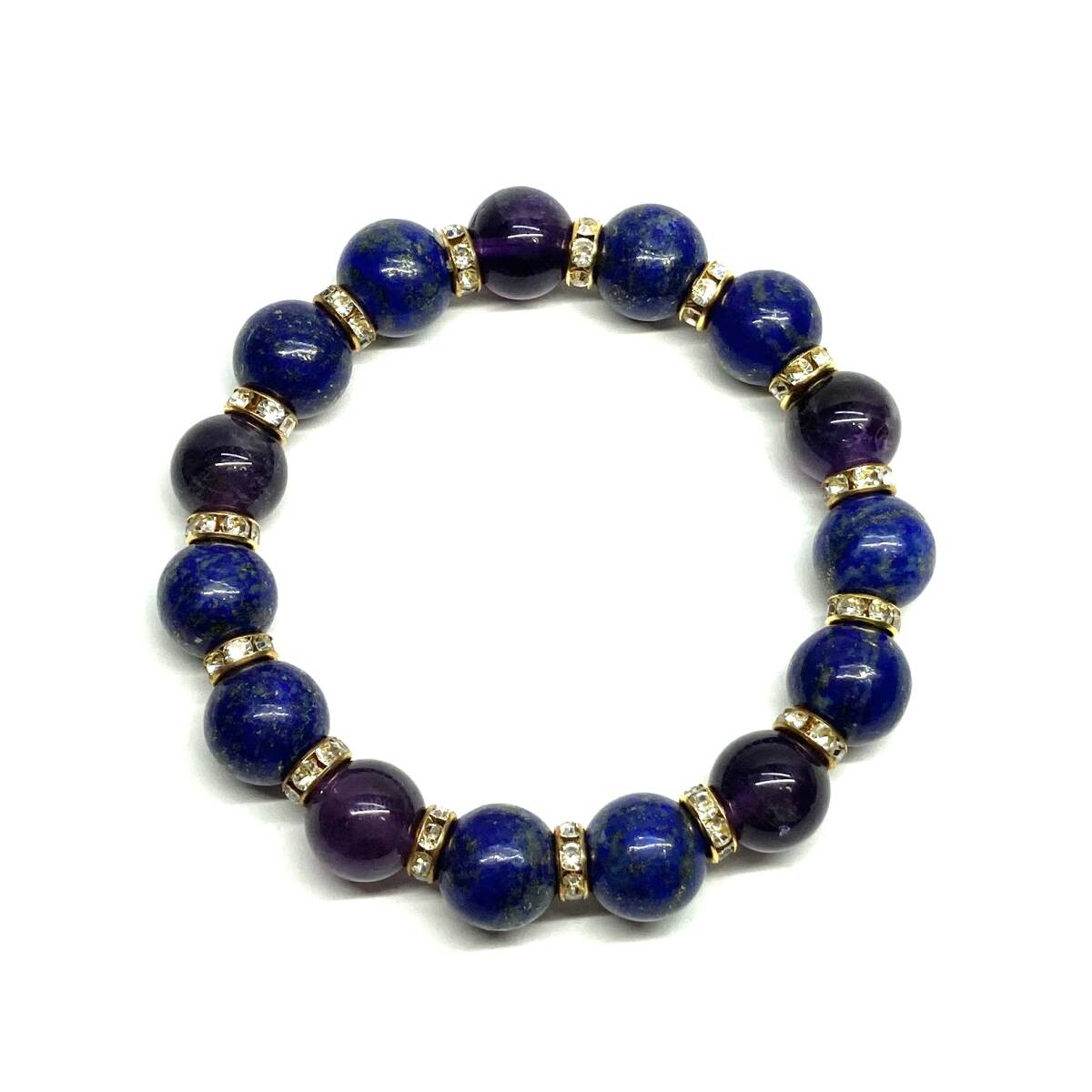 こちらは、ラピスラズリとアメジストを組み合わせたパワーストーンブレスレットです。間にはロンデルを挟み高級感あるデザインに仕上げております。程よくインパクトがある12mm玉を使用して内周約18cmです。(サイズ変更の場合は取引ナビにてご連絡をお願いします。) 数に限りがございますので気になる方はお早めにどうぞ。