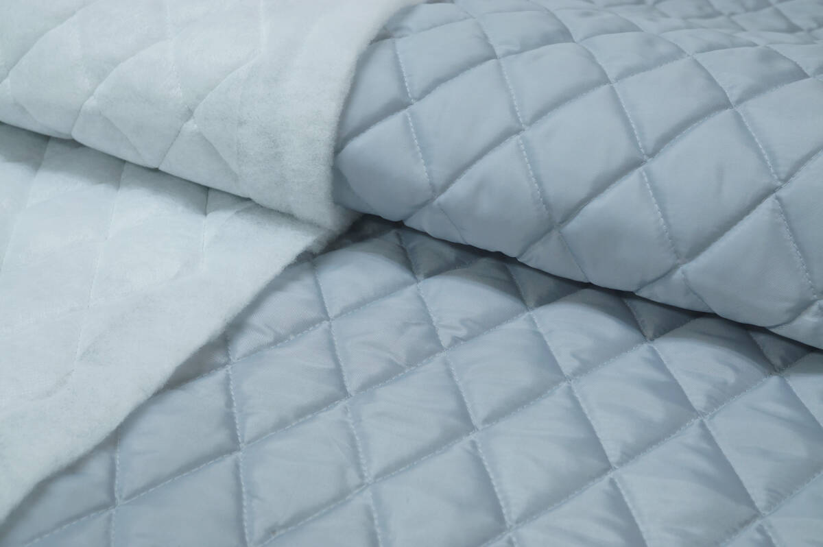 ポリエステル100%、無地・中わた・不織布の3層構造の微厚タイプで、ふっくらソフト系、微光沢、色調:ライトグレーでございます。