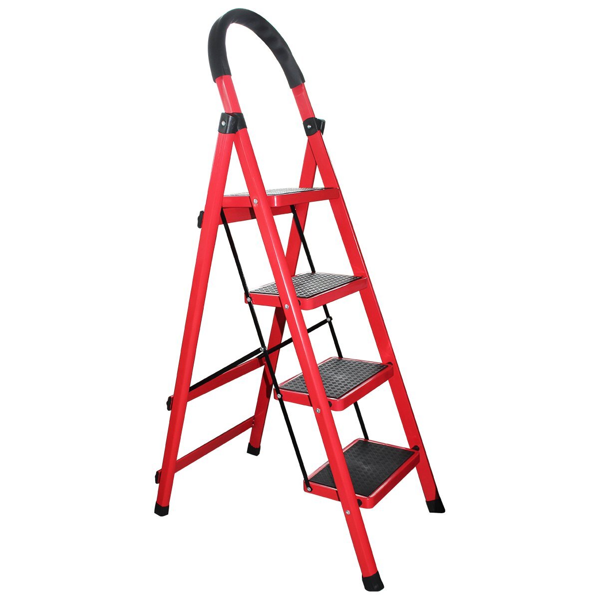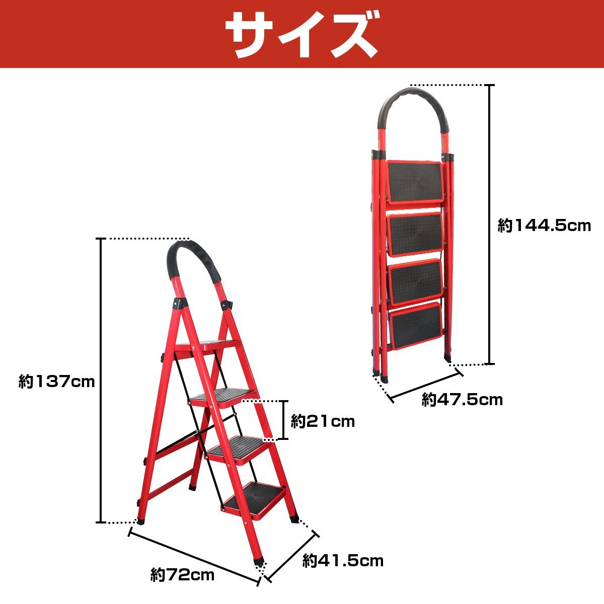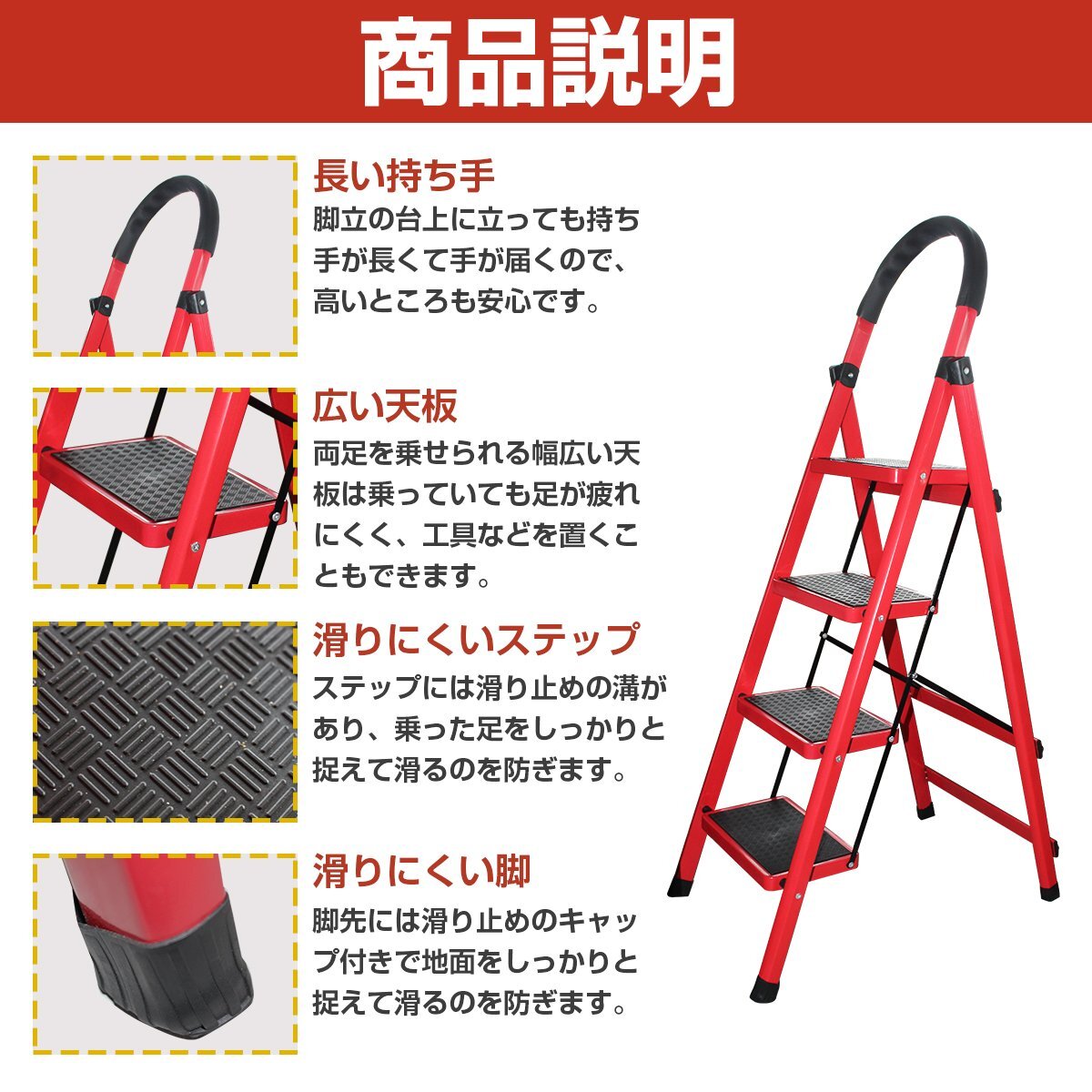 折りたたみ 4段 レッド/赤 ハシゴ はしご 梯子 脚立 足場 96cm アルミラダー 踏み台 4段ステップ 屋内用 ラバー ゴム