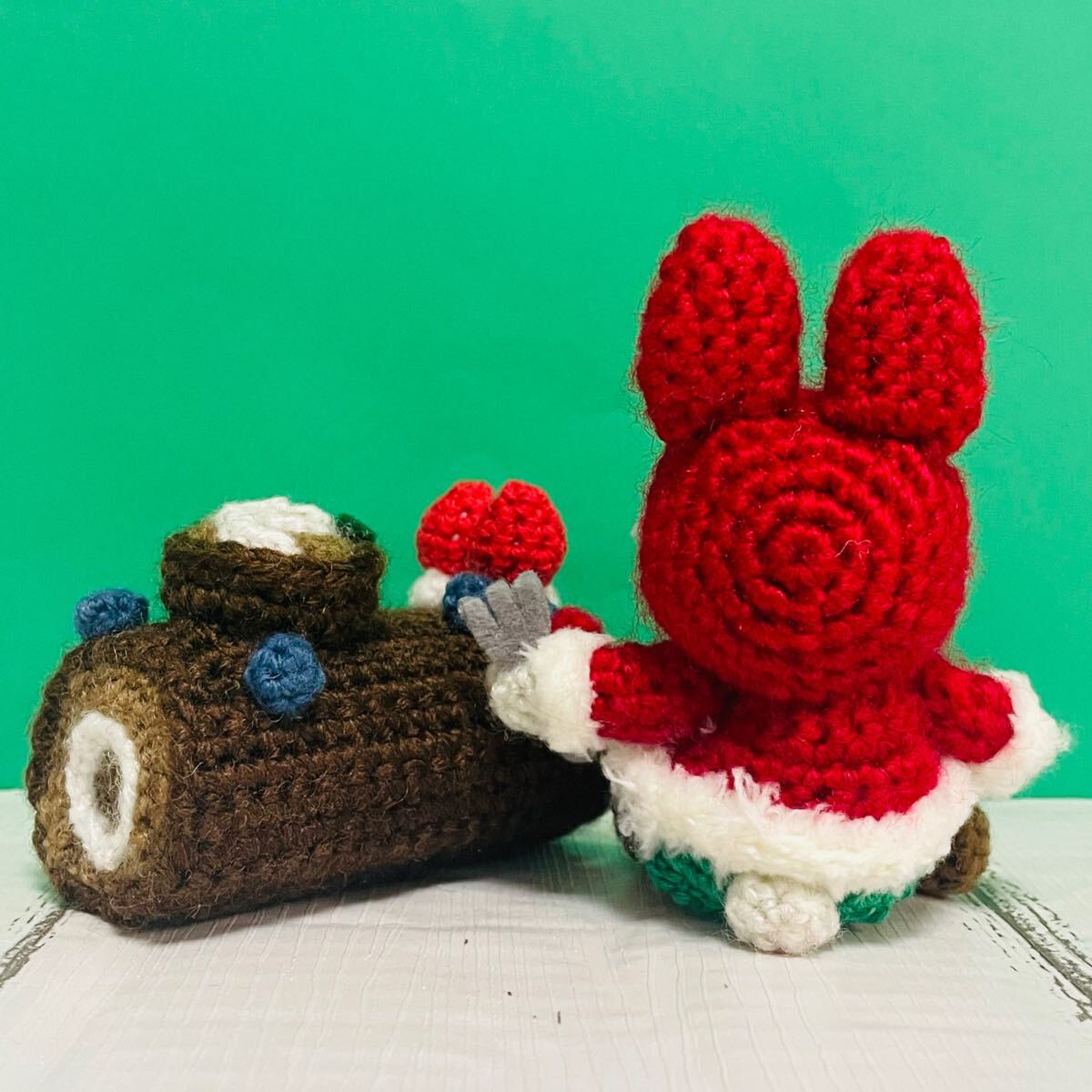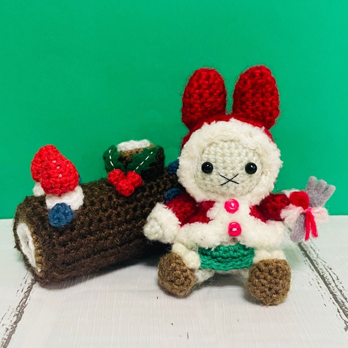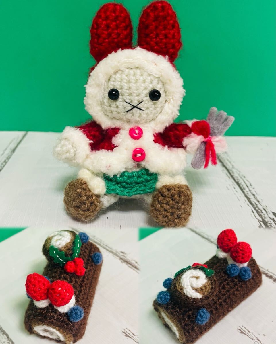 モコモコな耳付きのサンタ風ポンチョにお着替えをさせたお座り体制のミッフィー風あみぐるみを製作致しました☆