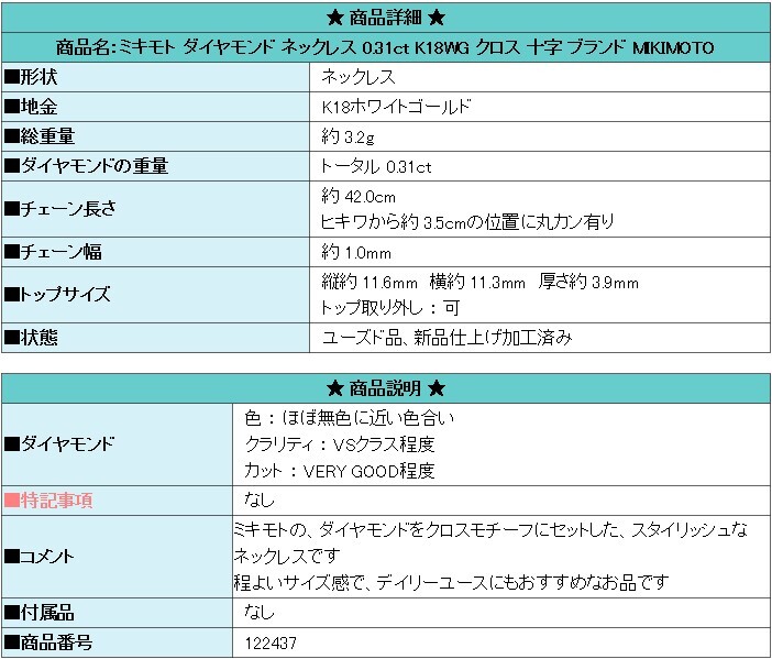 | ■コメント | ミキモトの、ダイヤモンドをクロスモチーフにセットした、スタイリッシュなネックレスです 程よいサイズ感で、デイリーユースにもおすすめなお品です |