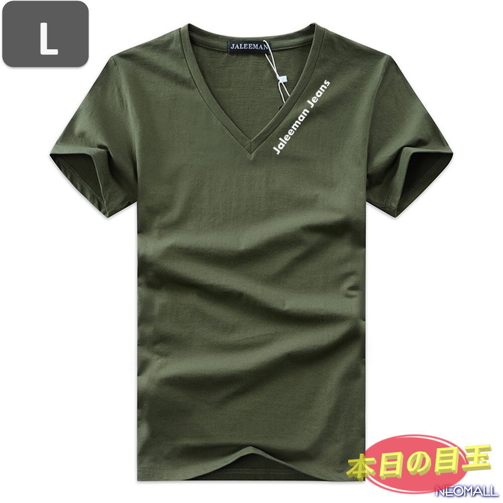 本日のお買得 ☆ Vネック 半袖 Tシャツ【451】 グリーン Lサイズ トップス シャツ シンプル イラスト デザイン 春夏