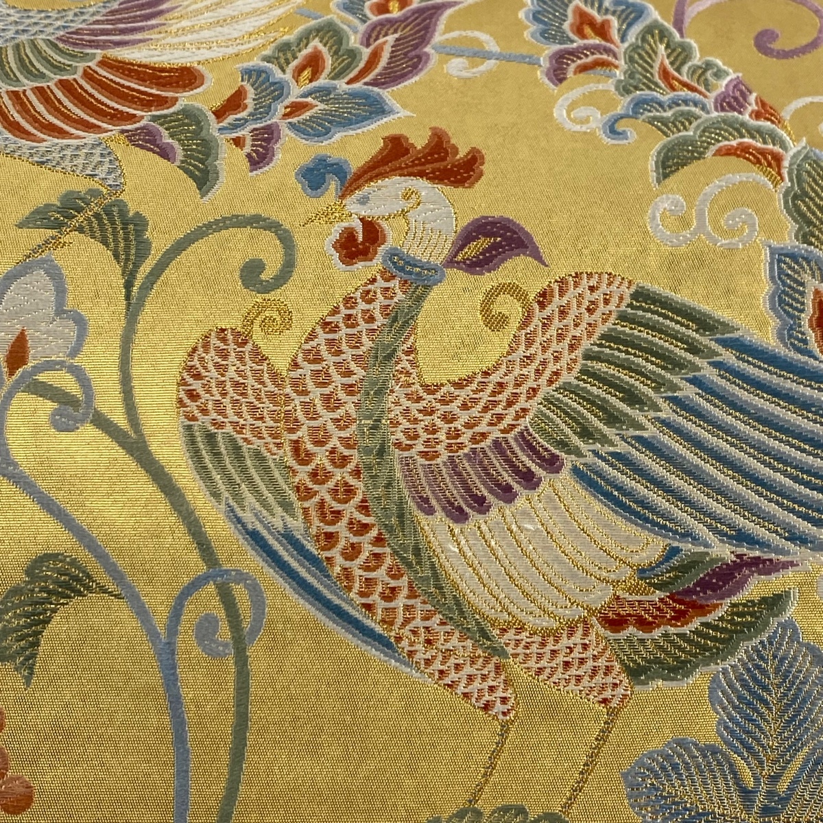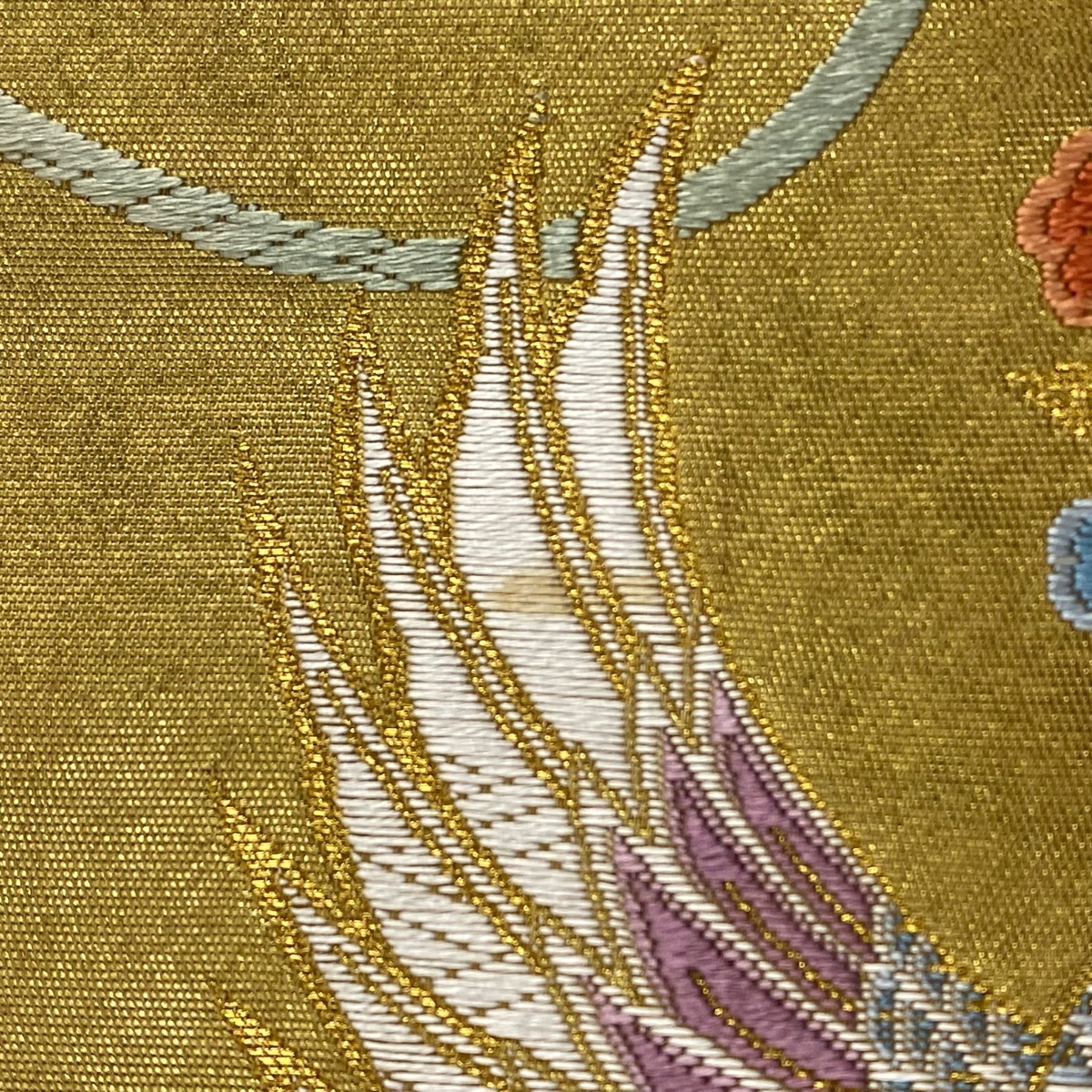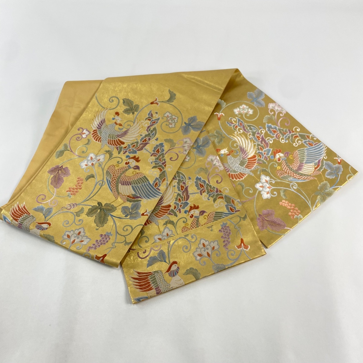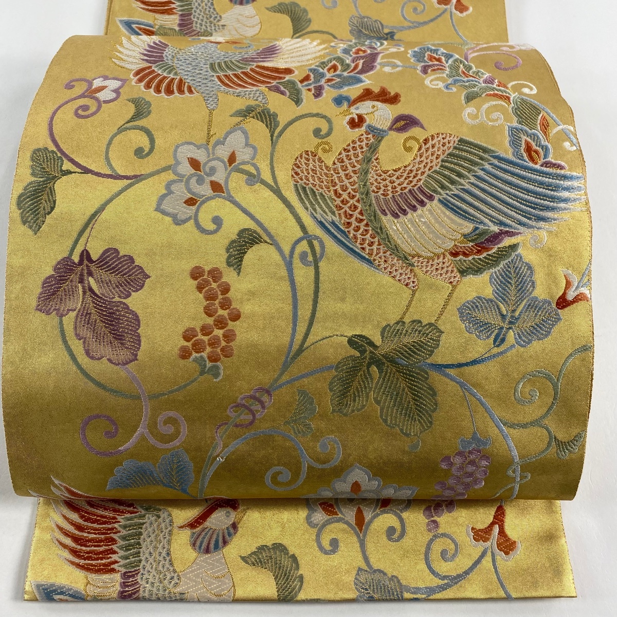 | 袋帯 秀品 鳳凰 葡萄唐草 金糸 箔 金色 お太鼓柄 正絹 【中古】 |