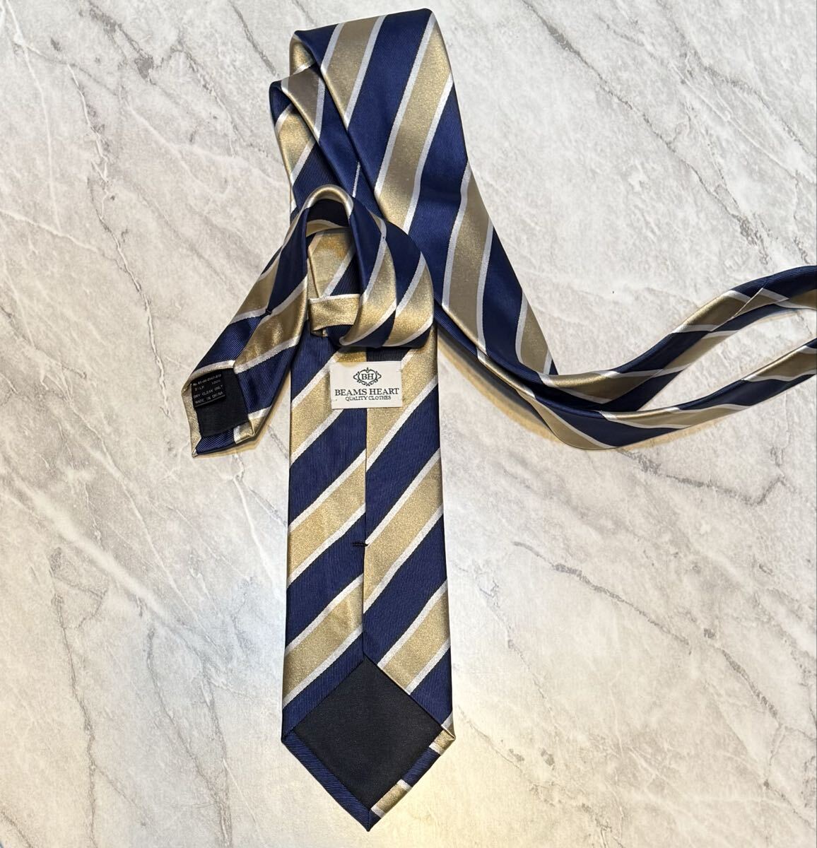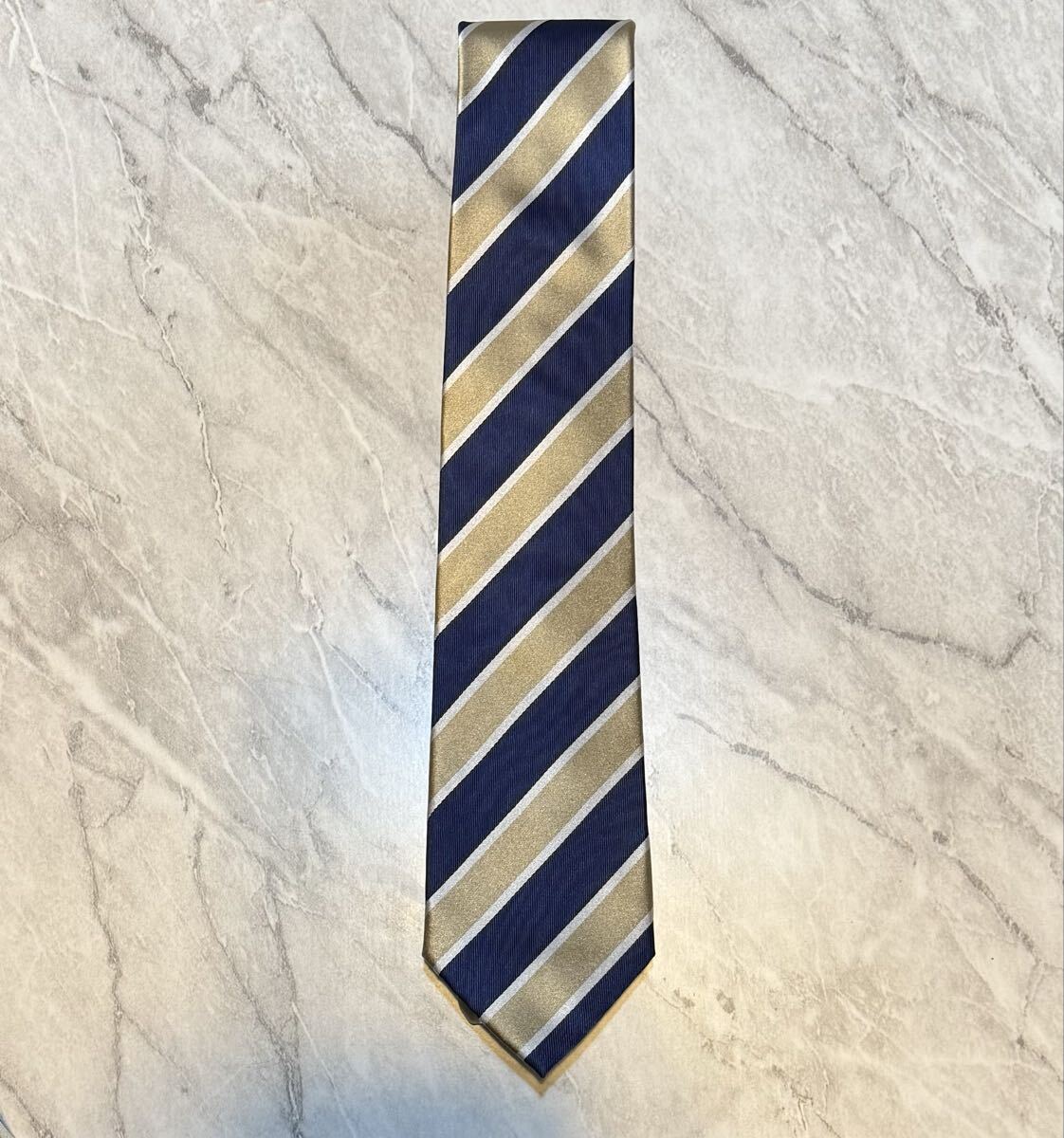・上質で肉厚なシルク100%を使用したネイビーゴールドのデザインがお洒落なレジメンタル柄のネクタイとなります。
