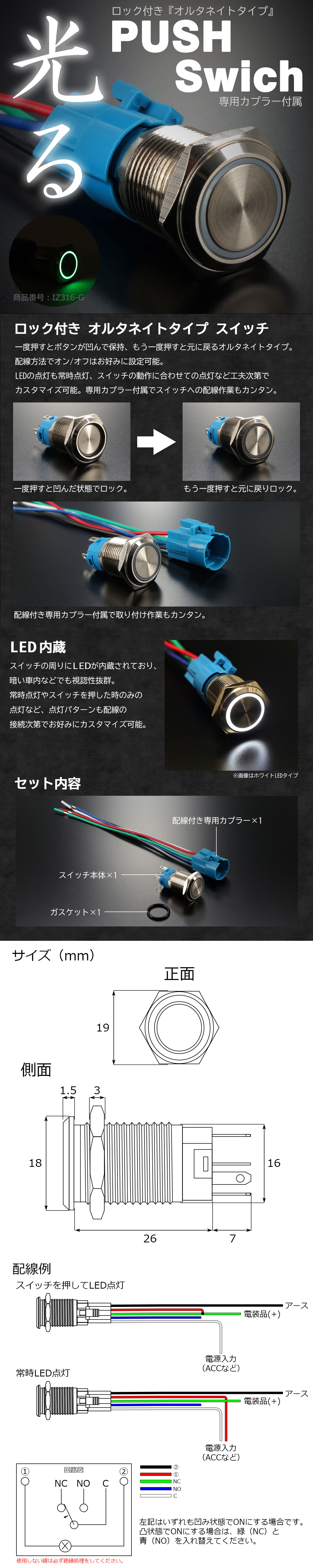 ■商品コード IZ316-G ■商品タイトル プッシュスイッチ 18Φ グリーン LEDリング付き オルタネイトタイプ ■商品説明 一度押すとボタンが凹んで保持、もう一度押すと元に戻るオルタネイトタイプ。 配線方法でオン/オフはお好みに設定可能。 LEDの点灯も常時点灯、スイッチの動作に合わせての点灯など工夫次第で カスタマイズ可能。専用カプラー付属でスイッチへの配線作業もカンタン。 ■商品概要 ・LEDカラー:グリーン ・スイッチ種類:オルタネイト式 ・動作電圧:DC12V (MAX 3A) ・入数:数量1で1セット ■サイズ:画像に掲載 ■注意 ※出品商品はタイトルのサイズ・発光色です。 ■その他カラー |