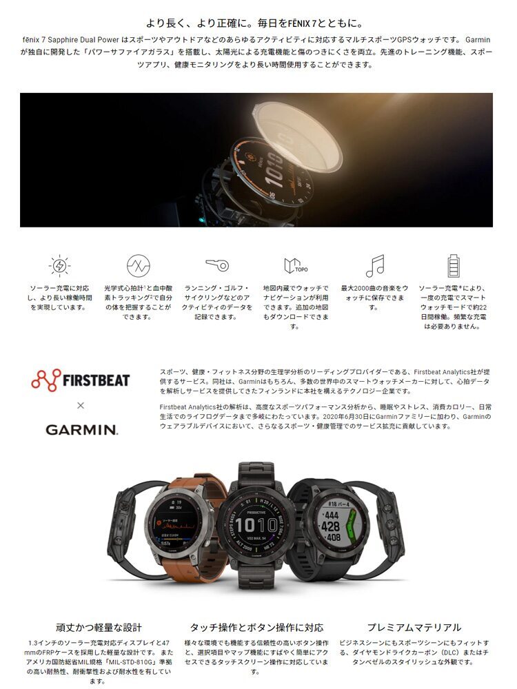 fenix 7 Sapphire Dual Power はスポーツやアウトドアなどのあらゆるアクティビティに対応するマルチスポーツGPSウォッチです。