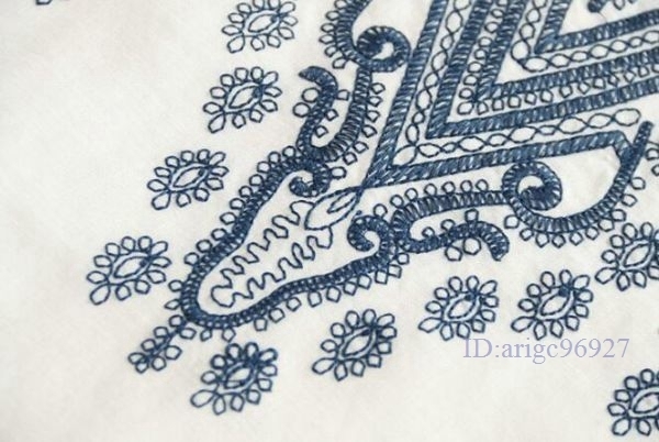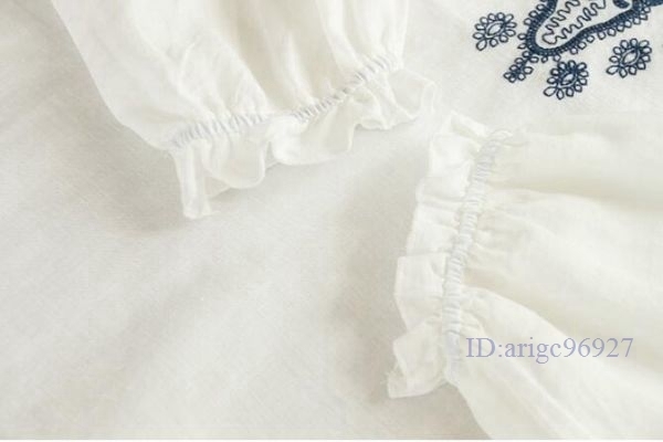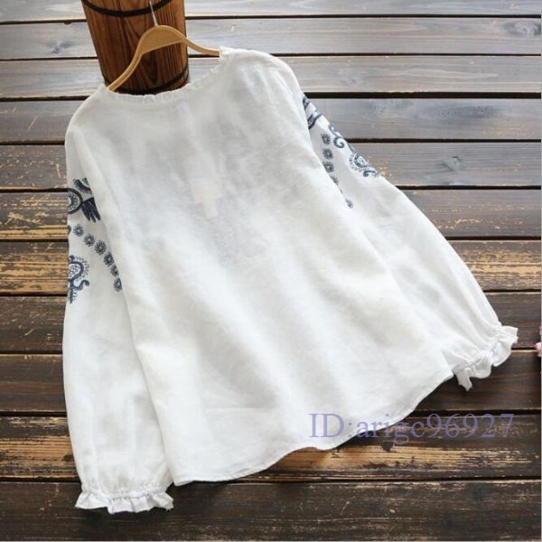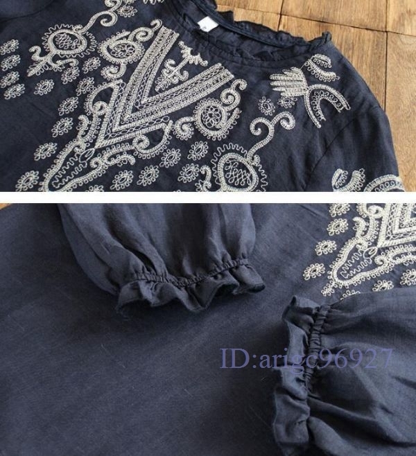 N278★新品秋**可愛い*コットンリネン*ゆったり大きいサイズ*体型カバー*長袖*刺繍ブラウスシャツ*紺M~XXLサイズ選べる/L
