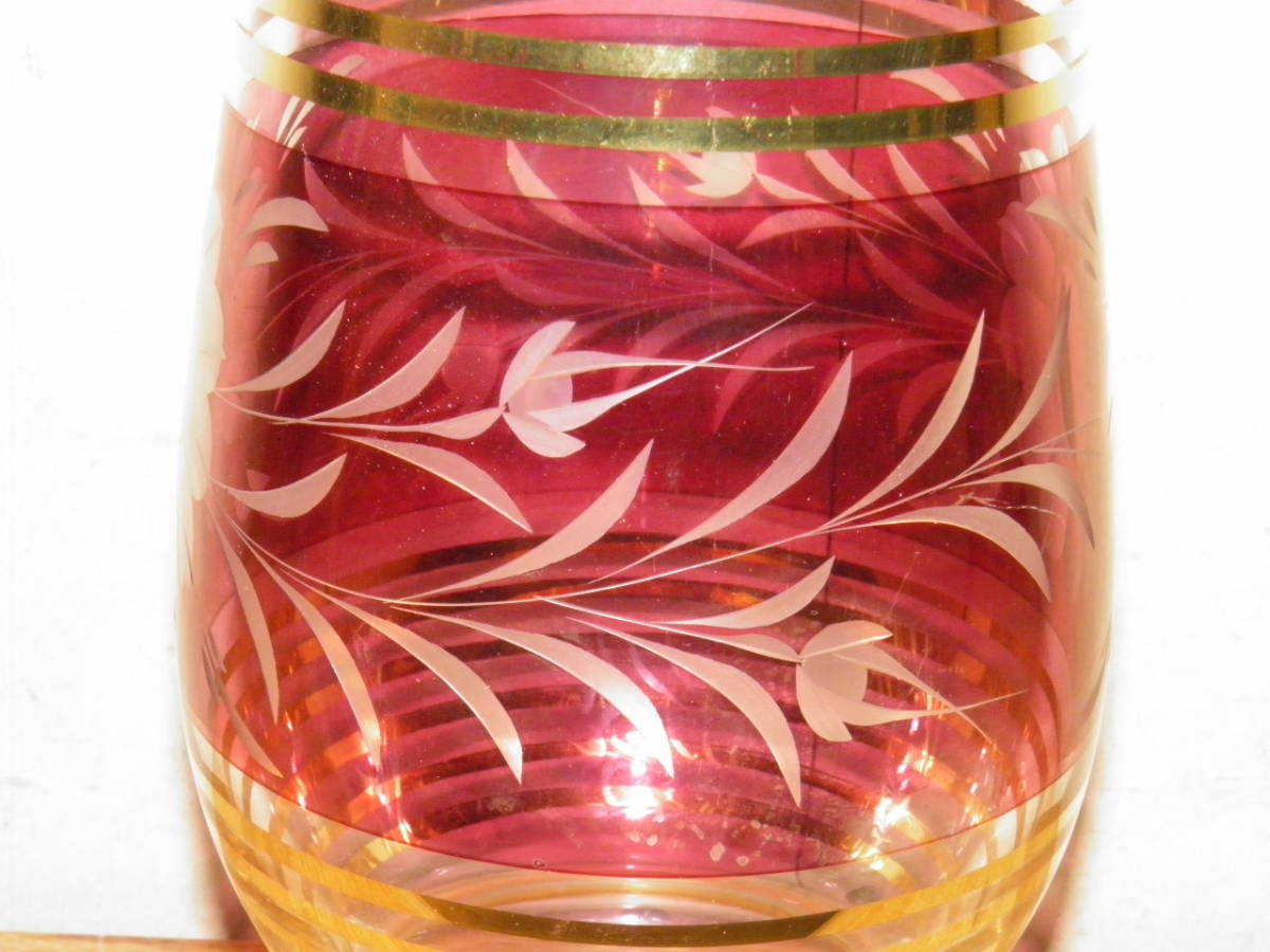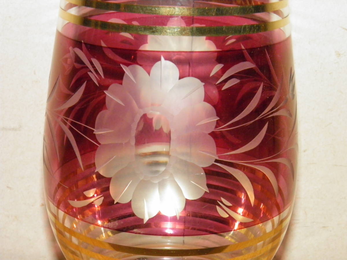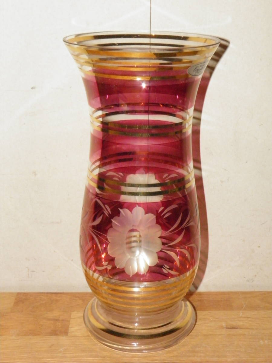 ボヘミアガラス 金彩 花瓶 高さ26cm Crystalex チェコ製 ワインレッド 切子 花柄 グラヴィールカット