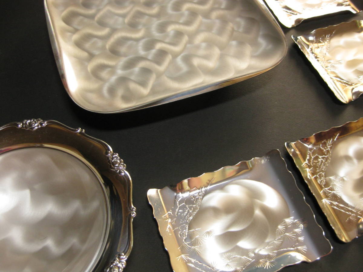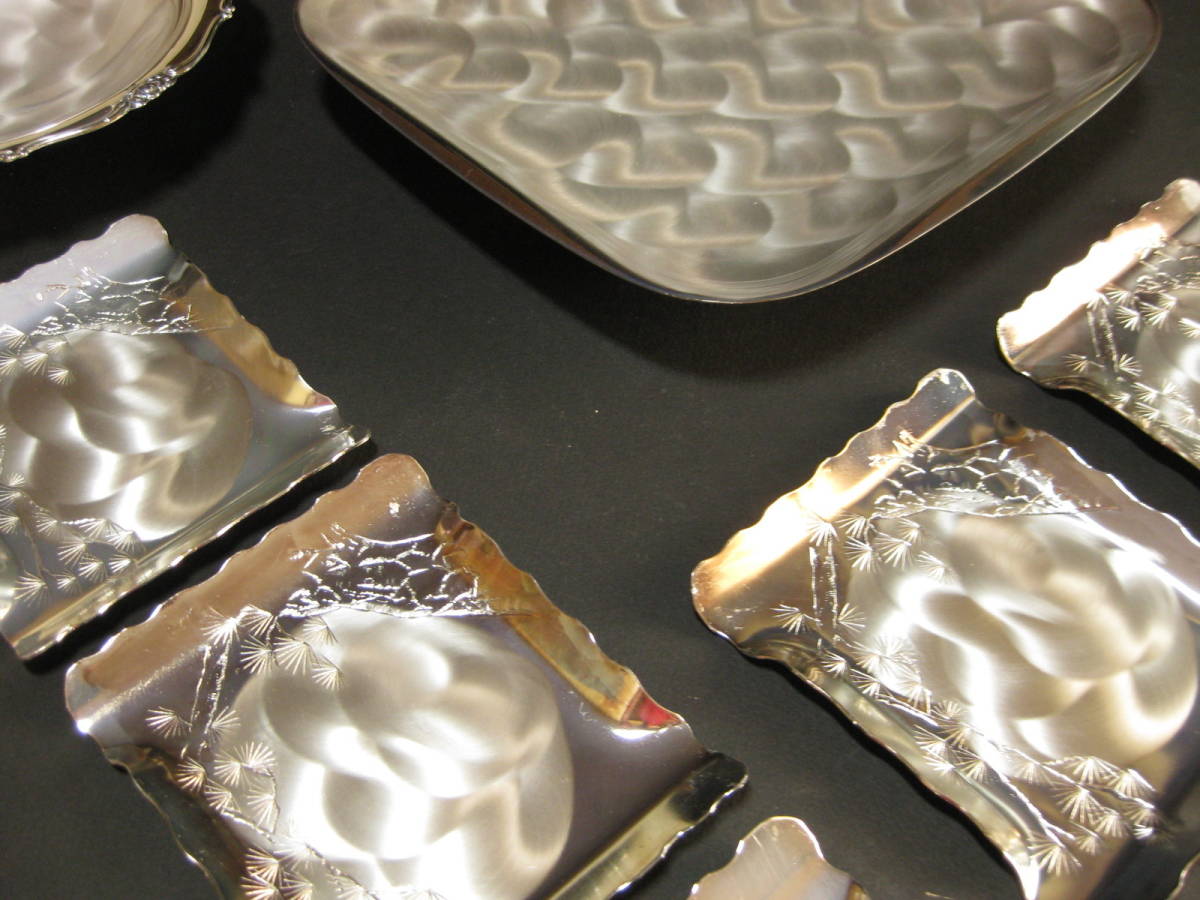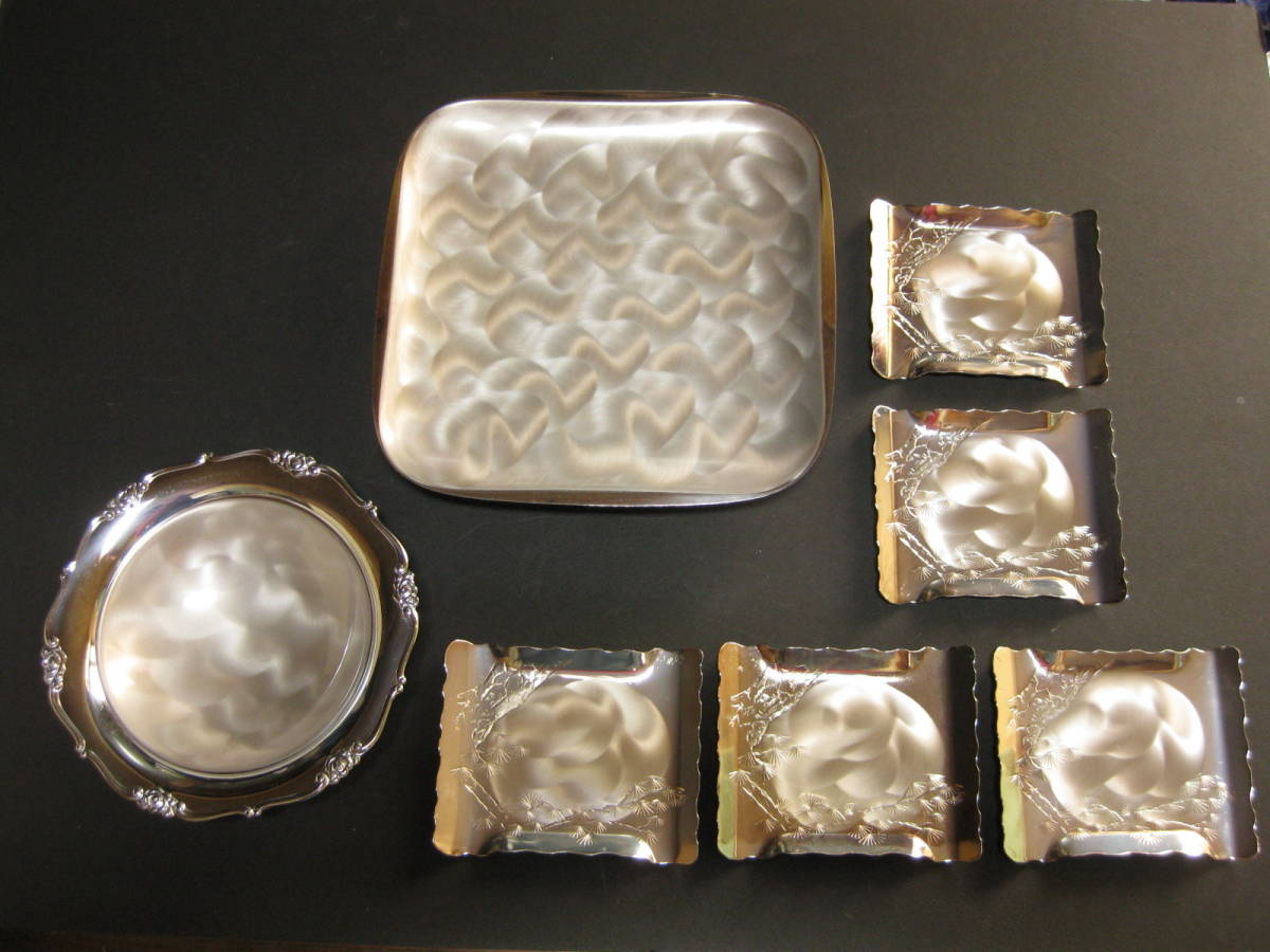 銀仕上げの上にごくごく薄いビニールの皮膜でカバーしており柔らかなパールシルバーの光沢を長く保ちます。(説明書より) チョコレートやキャンディ、生菓子、フルーツ、オードブルの盛りつけに、額皿としても使用可能です。コースターは5客揃っています。 丸形=直径178mm×高さ37mm 四角形=225mm×225mm×高さ32mm コースター=120mm×100mm×高さ8mm 実際の色合いは、写真4枚目が近いです。 丸形は裏面に多少傷あり。 箱は古いのですが、それぞれキチンとございます。 佐川急便での発送となります。。