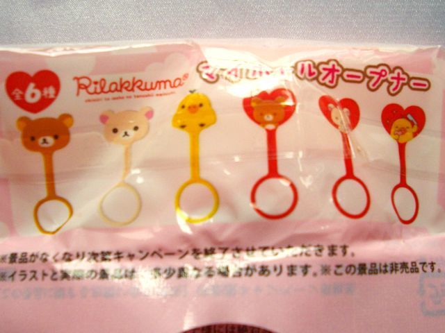 リラックマ/マイボトルオープナー/№6/伊藤園/非売品★新品未開封/送料込み★ ●カラー:画像でご覧ください。 ●材質:TPR(熱可塑性ゴム) ●重量:約12g ●種類:全6種紹介画像のいちばん右(画像②参照) ・2014年に伊藤園が実施した『リラックマ マイボトルオープナープレゼントキャンペーン』にてお茶のボトルネックについていたものです。 ・この商品は伊藤園の定番シリーズのデザインで、パッケージ裏面の全6種紹介画像のいちばん右のデザインになります(画像②参照)。 ・自宅で長期間にて保管しておりましたので少しでも気になる方のご入札はお控えください。 ★コンディション: N ※画像でご確認下さい。