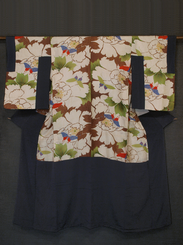 全体的な印象としてはきなり色がかった白色の地に、牡丹と蝶の文様が染められている羽二重の襲(かさね)です。袷仕立てで、ごく薄く綿が入れられています。また、裾フキ綿も薄く入れられています。 明治から大正期ごろにつくられたと思われるアンティークのお品です。濃藍(こいあい)色の八掛は、江戸縮緬に近いシボの大きな縮緬地です。 胴裏が全体的にくすんで黄変し、腰下に直径約 2mm の小穴が 1 か所あります。また、全体的にアンティークなりのくすみがあり、うっすらと黄変気味な部分があるほか、右衿先付近と裾へりに大きくすり切れている部分がちらほらとあります。こまかな黄変やうすよごれが若干ありますが、そのほかに目につく大きなしみやよごれ、褪色などのダメージは見あたりませんが、状態ランク=「D」のご着用対象外、リメイク素材用とさせていただきます。 |