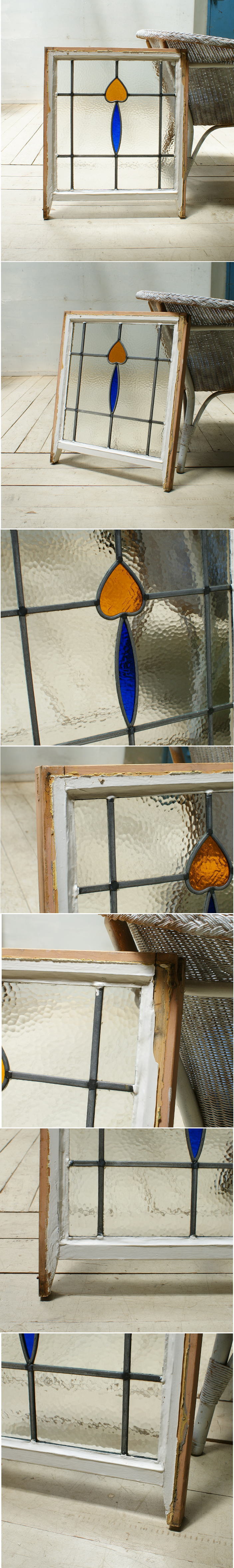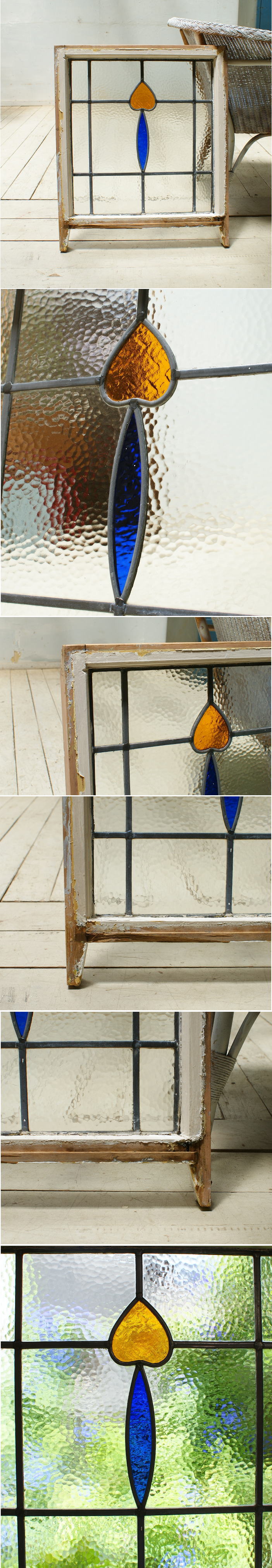 イギリスの蚤の市で見つけてきたアンティーク ステンドグラスです。 イギリスの古いおウチから取り外されたものです。日差しの良い窓辺に飾ると光の加減で 色々な表情を見せてくれます。 ショップディスプレイのアクセントにも おすすめです。 ガラス部、小キズ、気泡(焼成時)は有りますが、ヒビ等の大きなダメージは有りません。木枠は当時のものです、ペイント剥がれや痛みがあります。古いものとご理解ください。   サイズ幅50cm  高さ59.5cm   厚み4cm 年代年代推定1930~1950年代