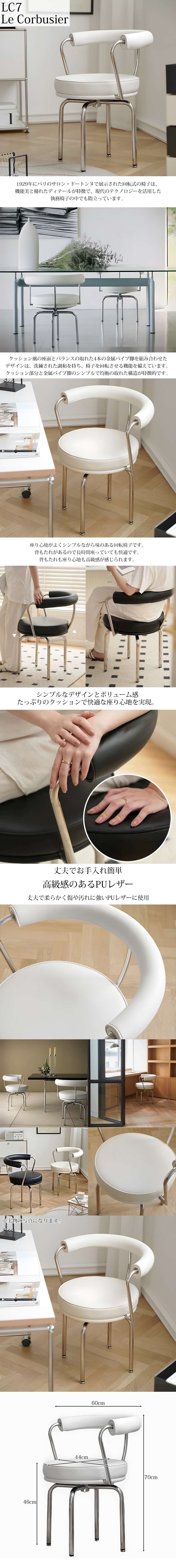 ![]() 1929年にパリのサロン・ドートンヌで展示された回転式の椅子は、 機能美と優れたディテールが特徴で、現代のテクノロジーを活用した 執務椅子の中でも際立っています。 クッション風の座面とバランスの取れた4本の金属パイプ脚を組み合わせたデザインは、 洗練された調和を持ち、椅子を回転させる機能を備えています。 クッション部分と金属パイプ脚のシンプルで均衡の取れた構造が特徴的です。 座り心地がよくシンプルながら味のある回転椅子です。 背もたれがあるので長時間座っていても快適です。 背もたれも座り心地も高級感が感じられます。 アジャスター付き 脚にはアジャスターがついており高さを調節してガタツキをなくします。 プラスチック製の底部なので床を傷つけません。 ■商品詳細 デザイナー:ル・コルビジェ/ Le Corbusier サイズ(約):幅60cm*奥行き50cm*高さ70cm*座面高46cm*座面直径44cm 重量(約):6.7kg 材質: ホワイトレザー(PVC) 脚部分:ステンレス ※簡単な組み立てが必要になります。 ※この商品はリプロダクト品になります。Cassina社の商品ではありません。 |