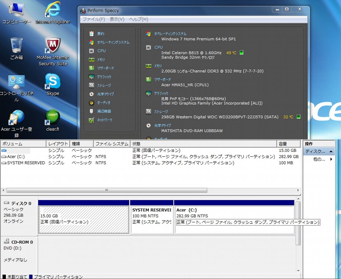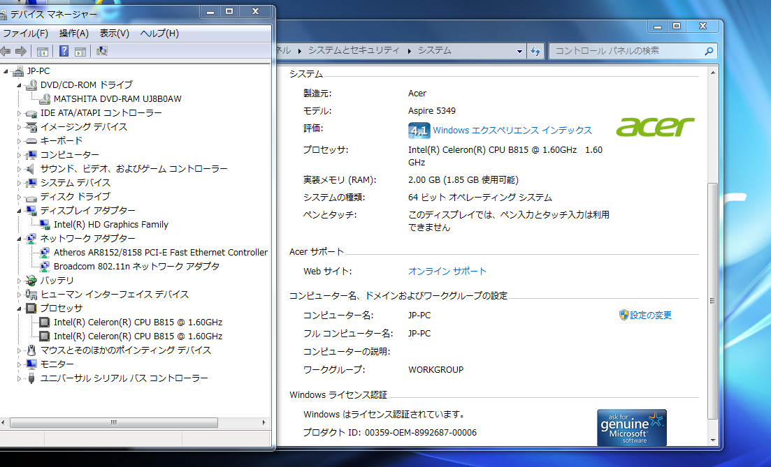 ストレージ(HDD) | 320GB HDD ソフトでチェック済--正常 Windows 7 Home 64bit リカバリー領域あり (簡単に再セットアップが可能です)。 トラブル時に工場出荷時への復元もでき安心してお使いできます SSDへの変更をおすすめします。 HDDに比べると起動やファイルの読み書きが大幅に高速になるだけでなく、 省電力、軽量、耐ショック性、低発熱のメリットがあります。 |