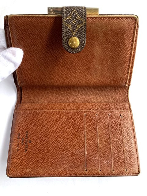 | この度は当店の商品をご覧頂き誠にありがとうございます。 ヴィトンノのがま口財布が入荷致しましたのでご提案させて頂きます。 しっかりした小銭入れの容量を持ったがま口財布「ポルトモネ ビエ ヴィエノワ」。 常に使いやすいデザインで定評のある一品です♪ 【状態】 表面:全体的に使用感があり日焼けしております。 内側:全体的に擦れがありポケットの中の表面ががれております。 現在べたつきはございません。 右側に破れがございます。(画像8参照) | |